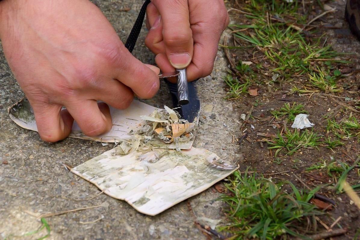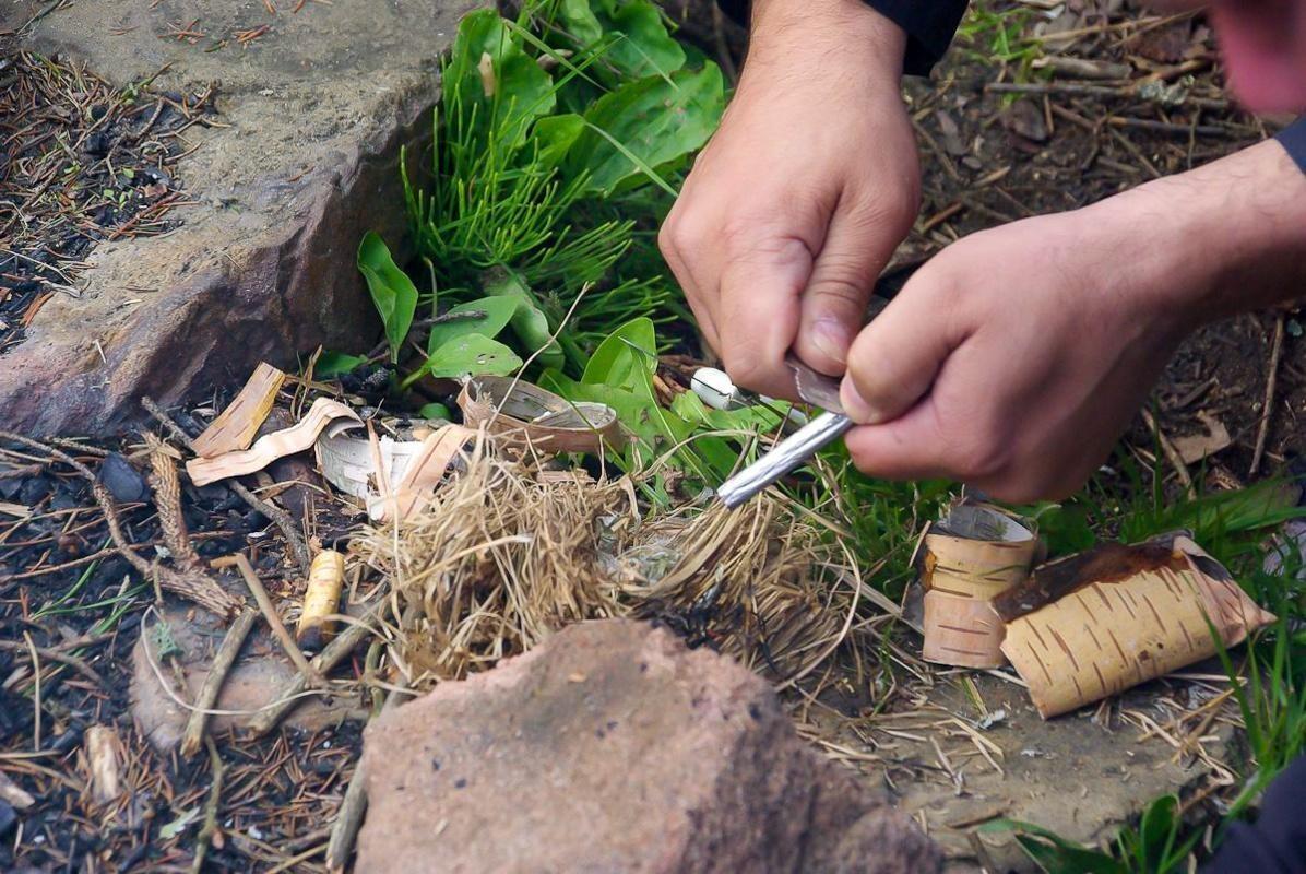 Feuerstahl erzeugt Funken auf Zunder aus Rinde