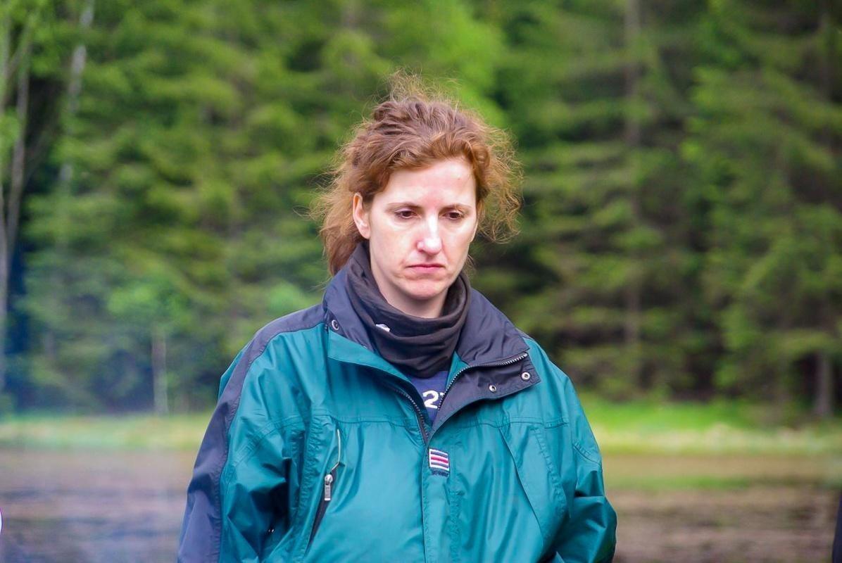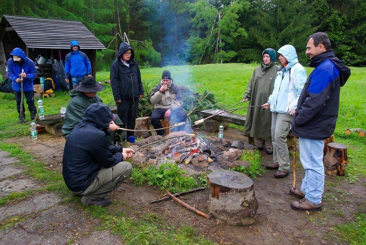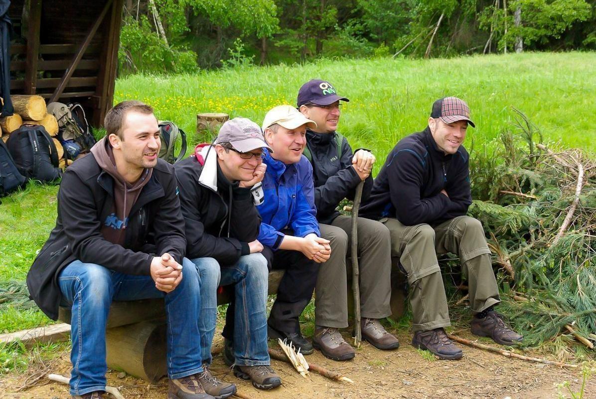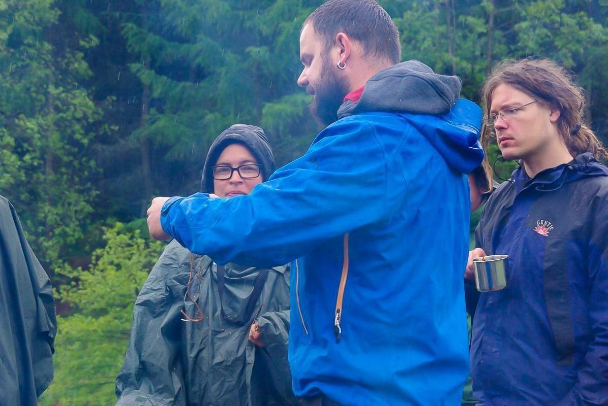 Gruppendiskussion über Outdoor-Techniken im Wald, Teilnehmer tragen Regenbekleidung