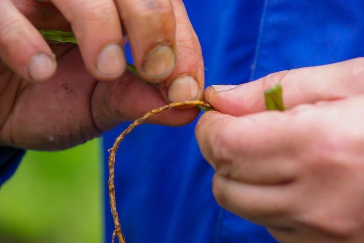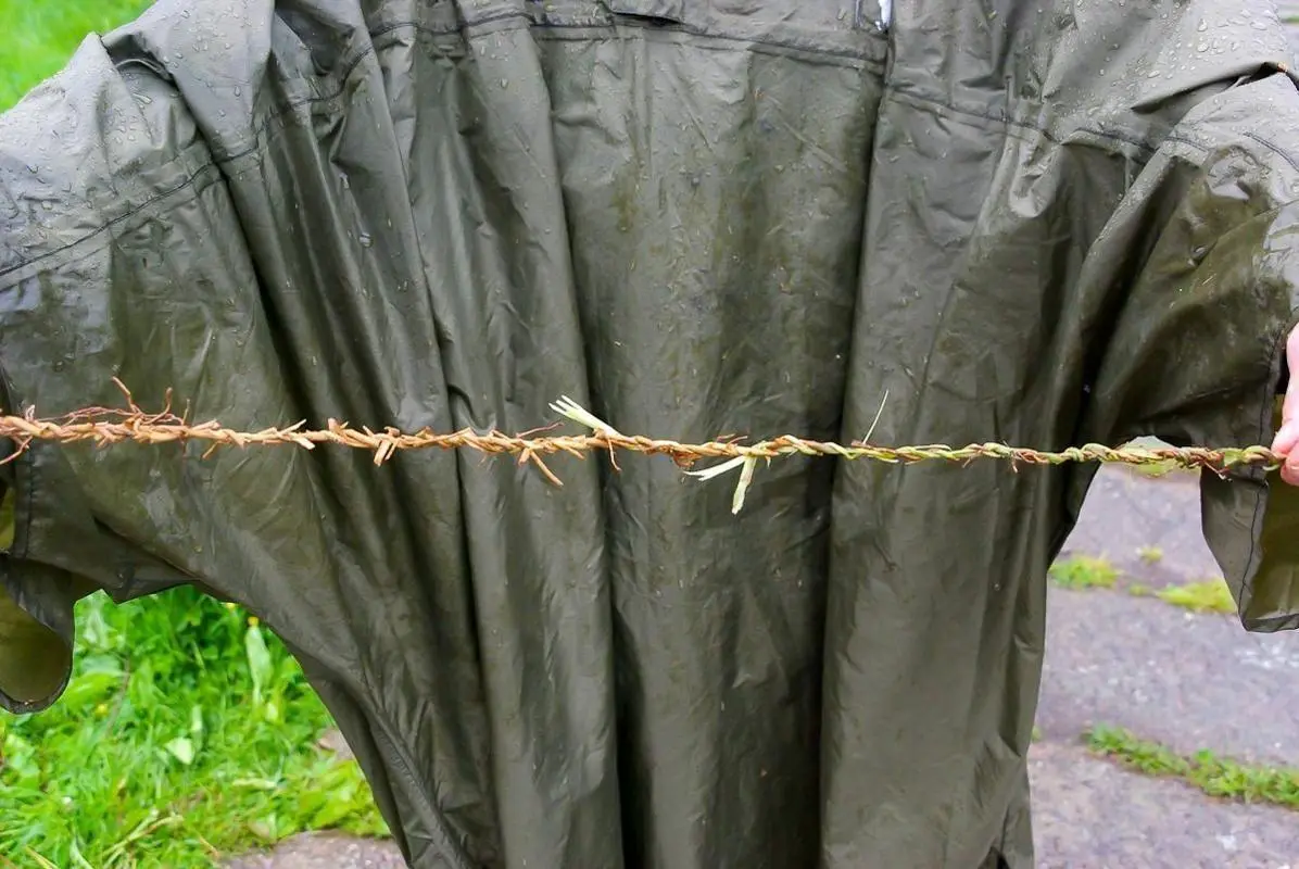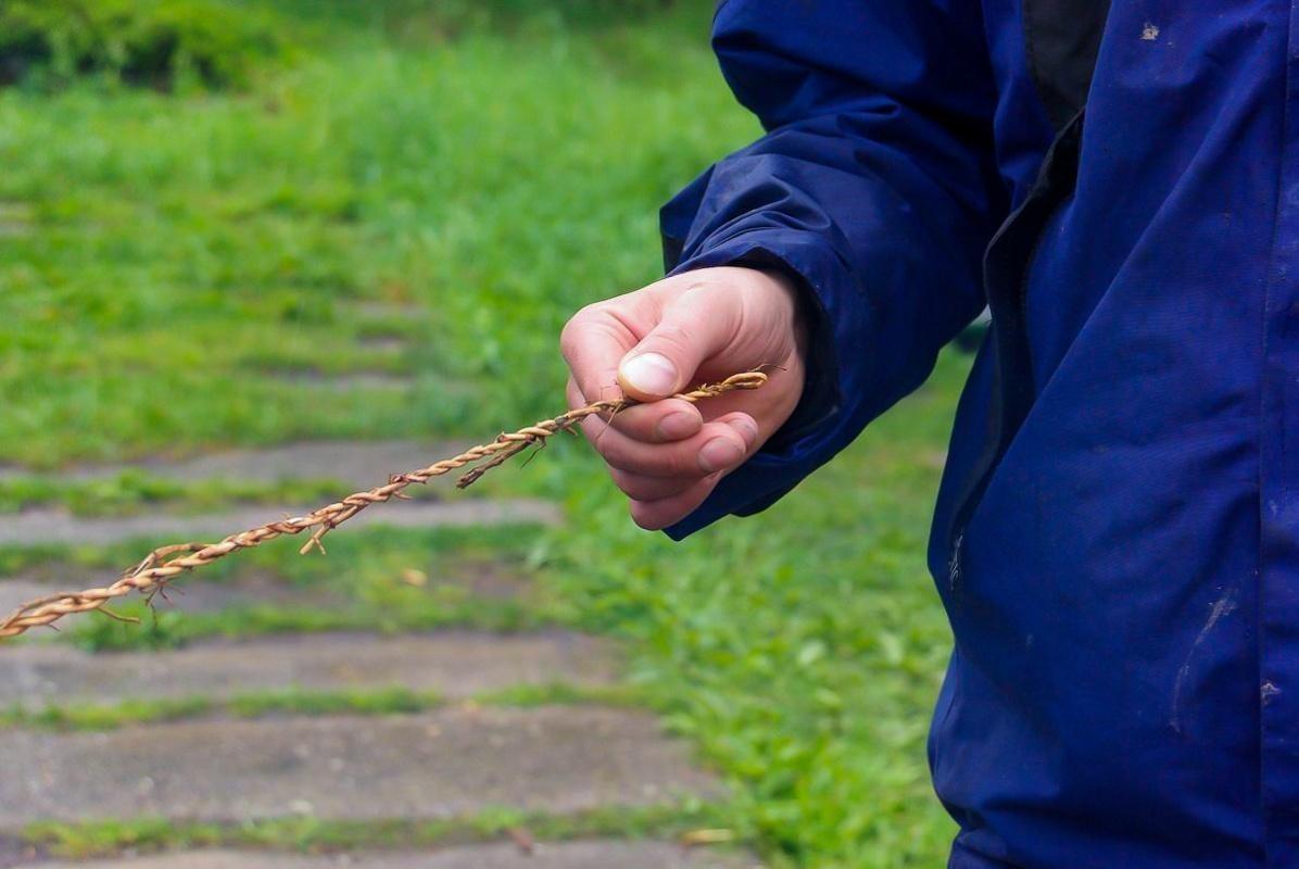 Selbstgebaute Schnur aus Pflanzenmaterial wird zwischen zwei Händen gehalten