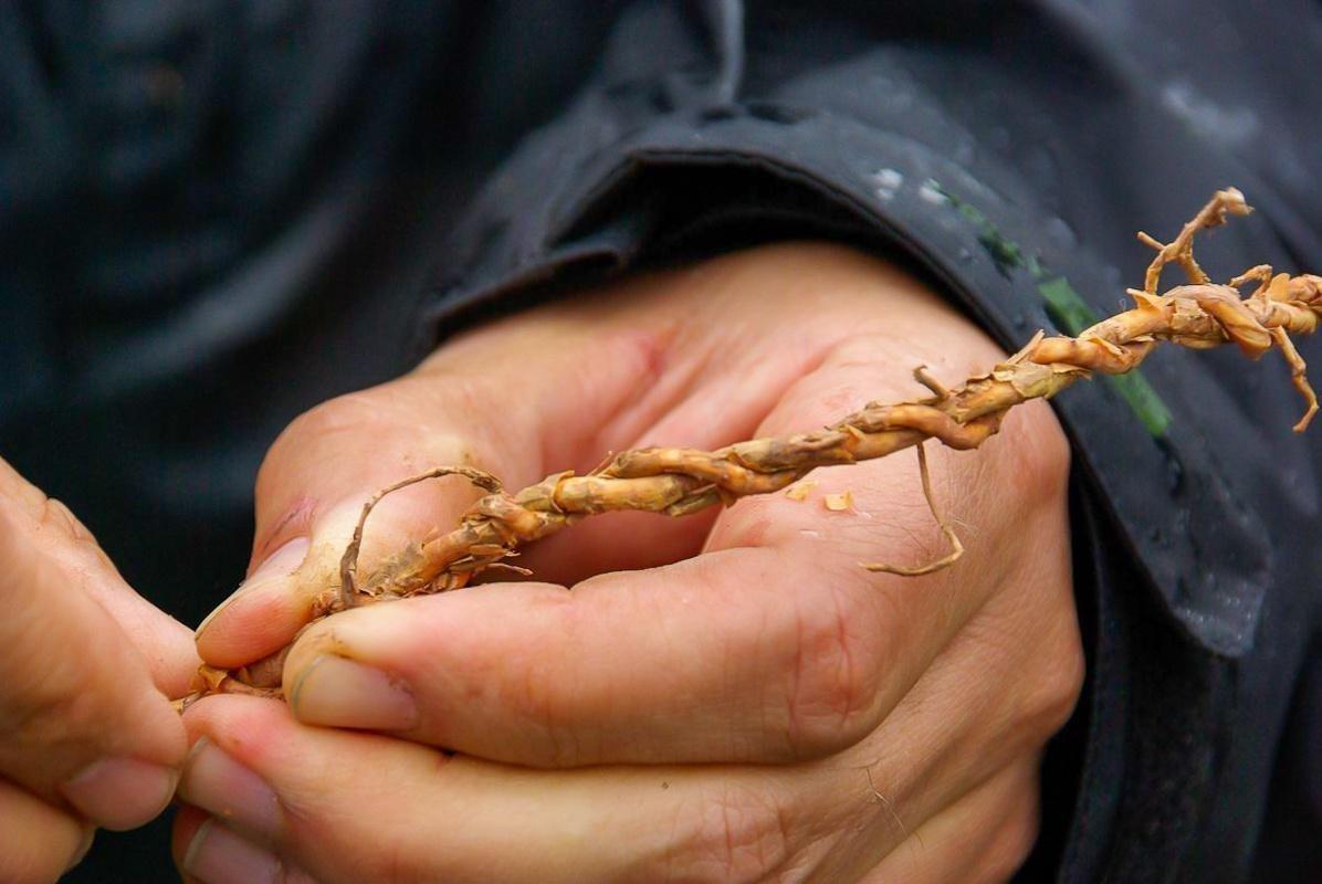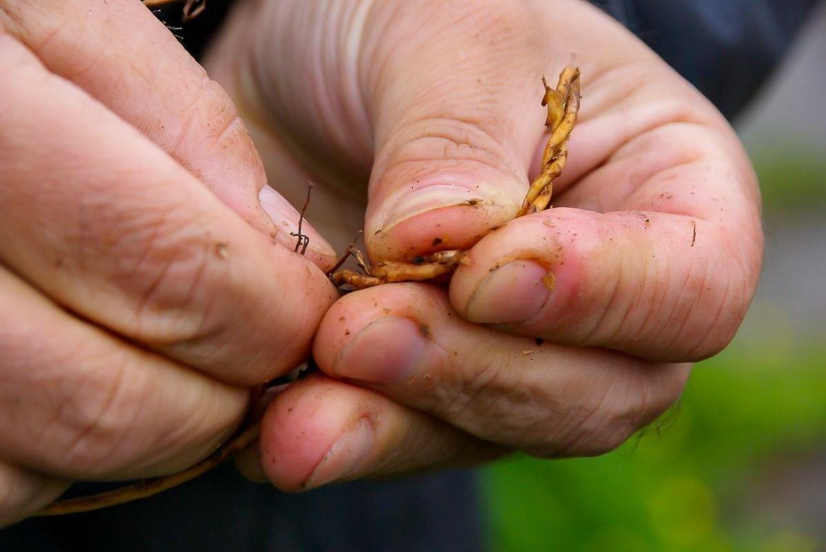 Hände halten einen geflochtenen Zweig mit kleinen Wurzeln