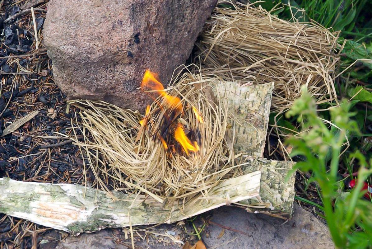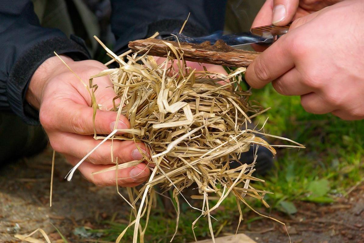 Feuerstahl erzeugt Funken auf Zunder aus trockenem Gras