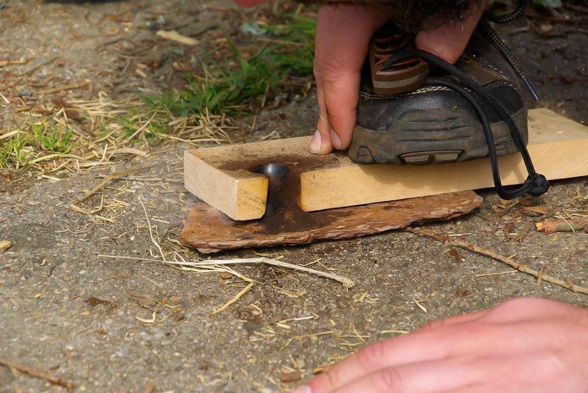 Holzstück wird mit einem Stock bearbeitet, um Glut zu erzeugen