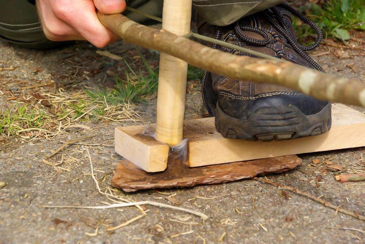 Holzfeuerbohrer erzeugt Rauch auf Zunderplatte durch Reibung