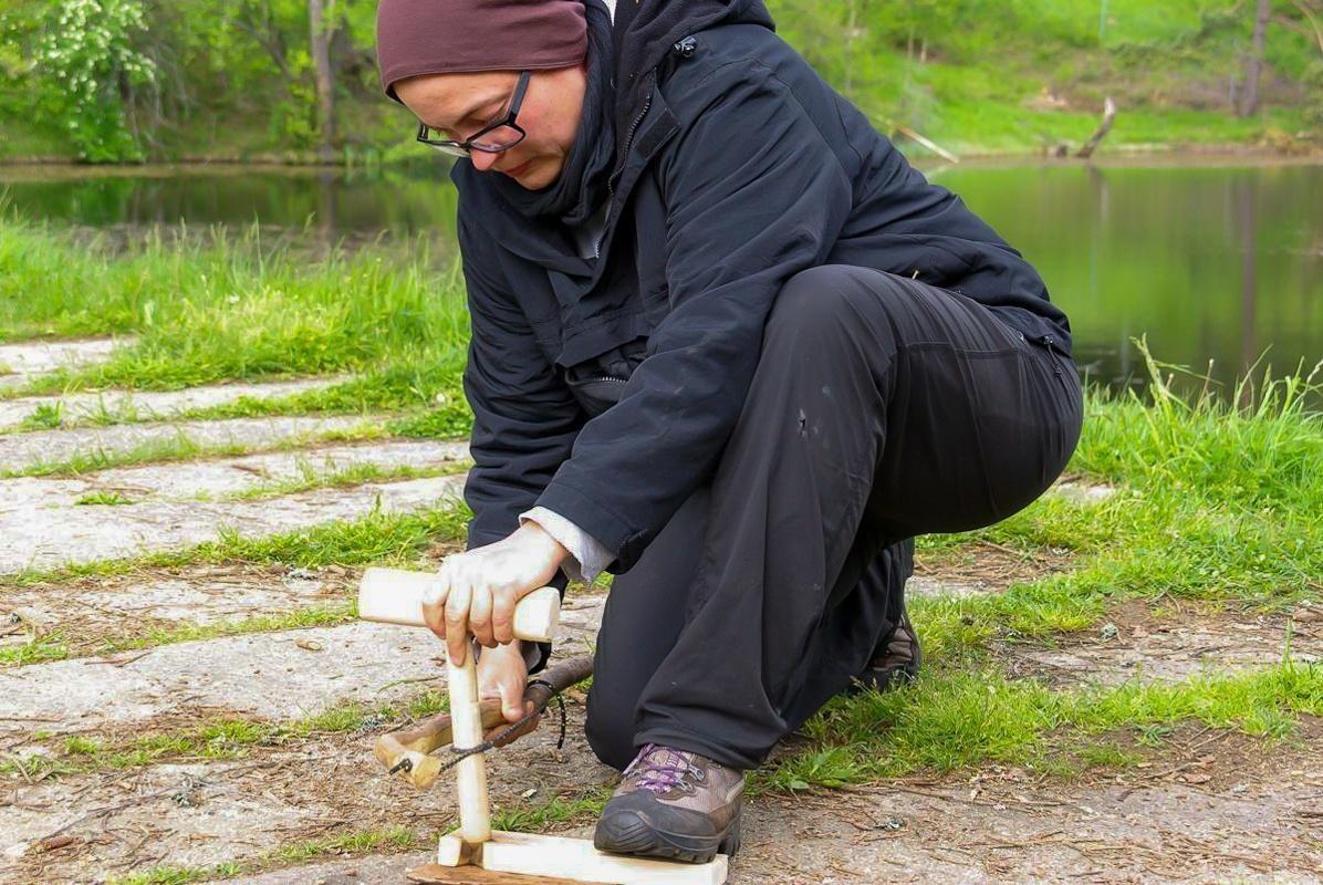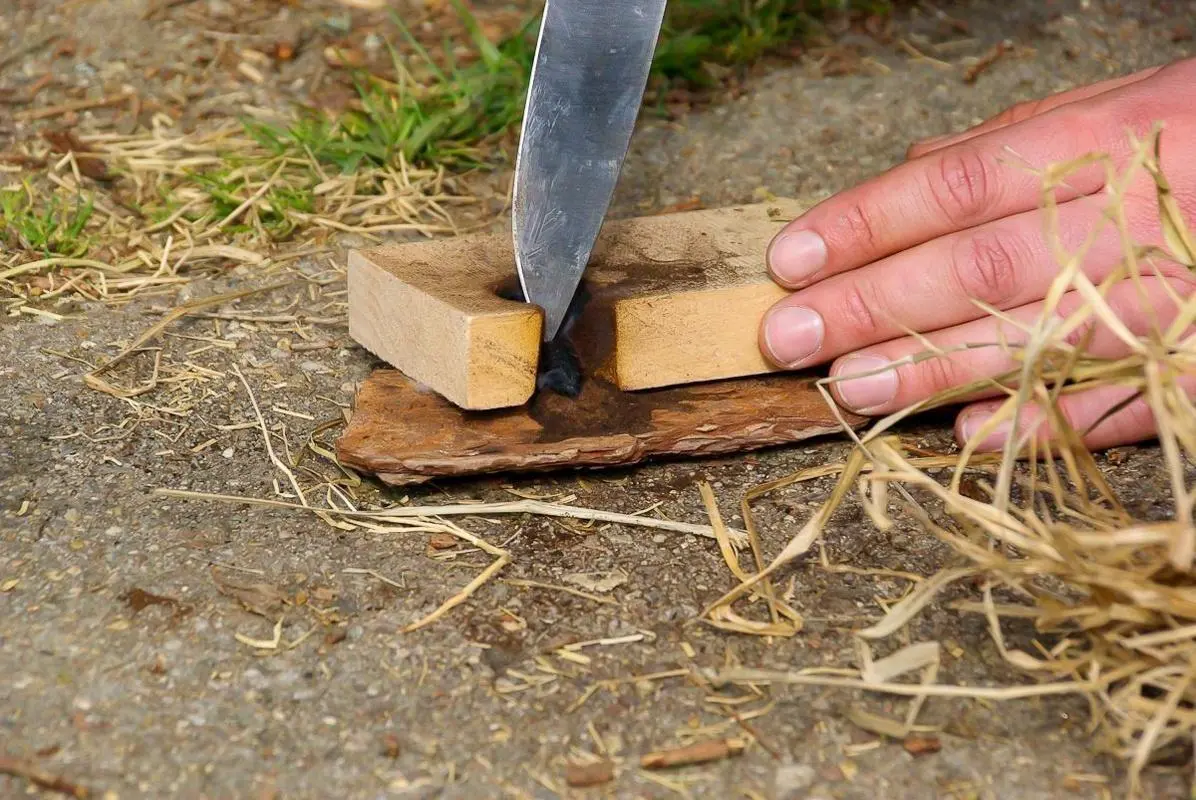 Holzstück wird mit einem anderen Stock bearbeitet, um Zunder zu erzeugen