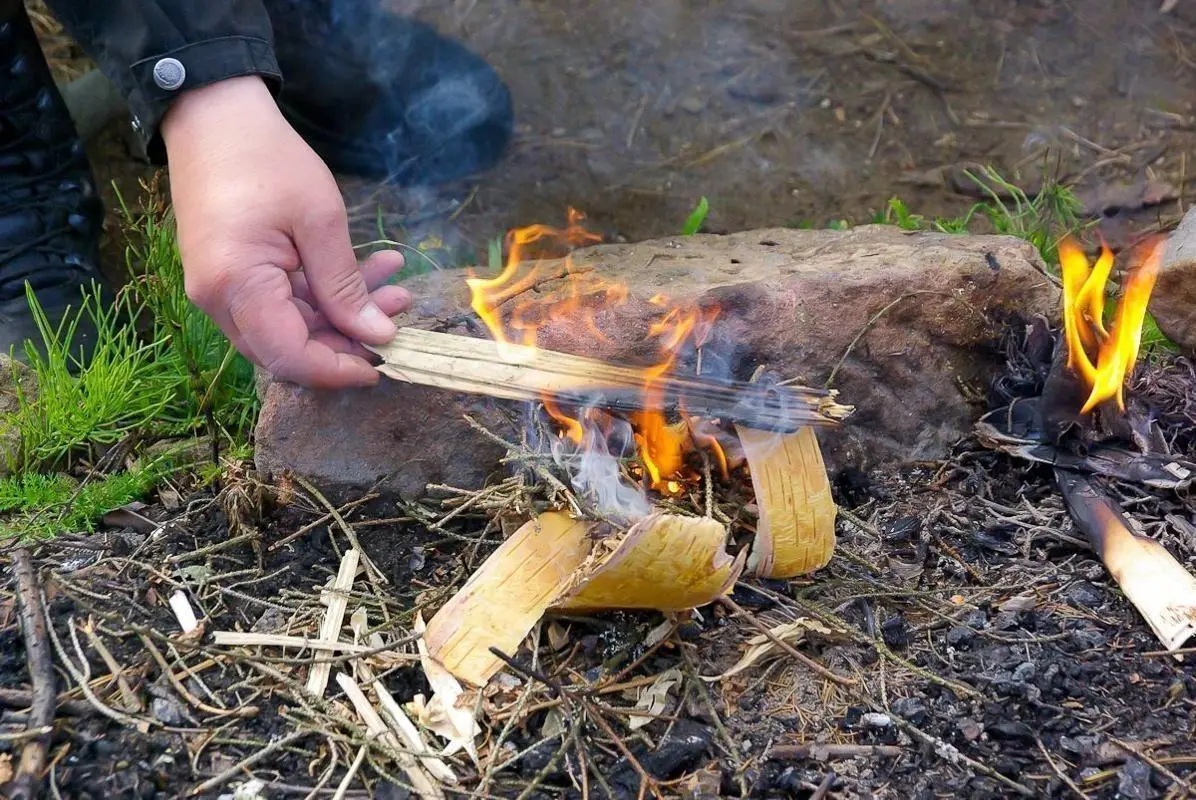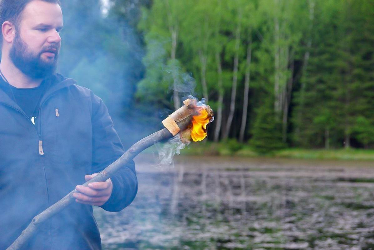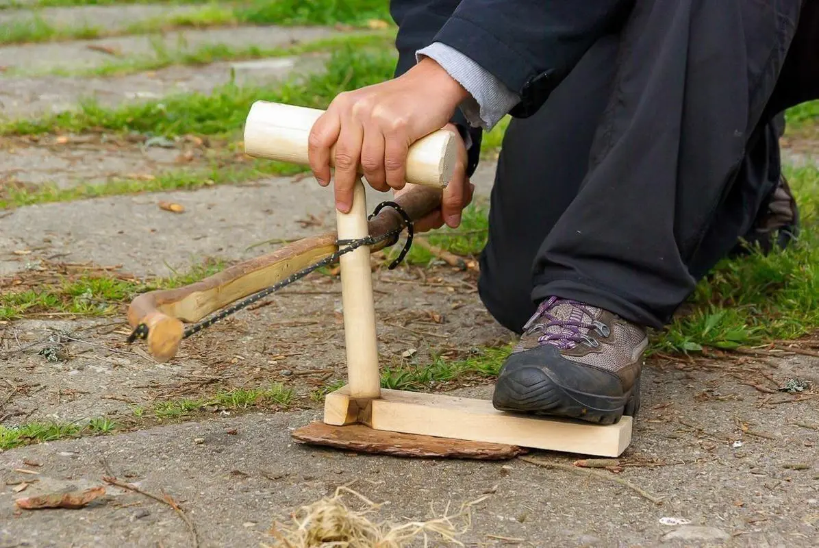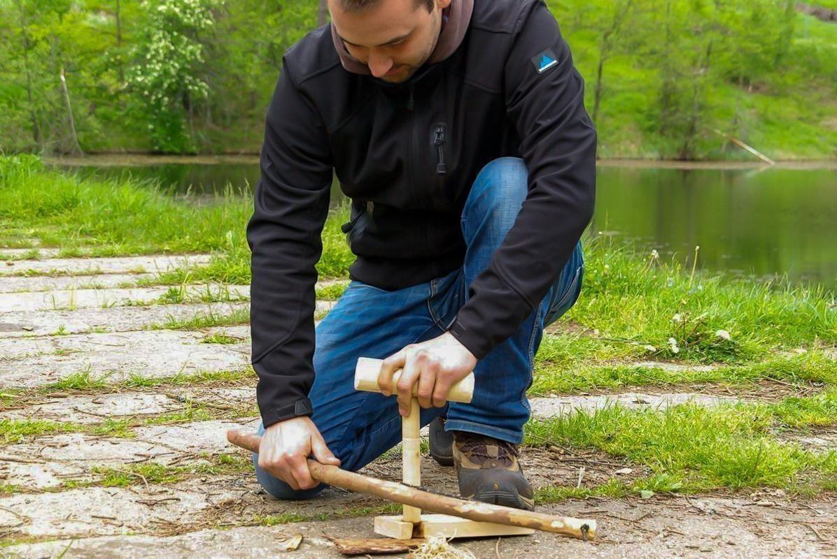 Mann nutzt einen Stock, um mit einem Feuerbohrer Zunder zu entzünden