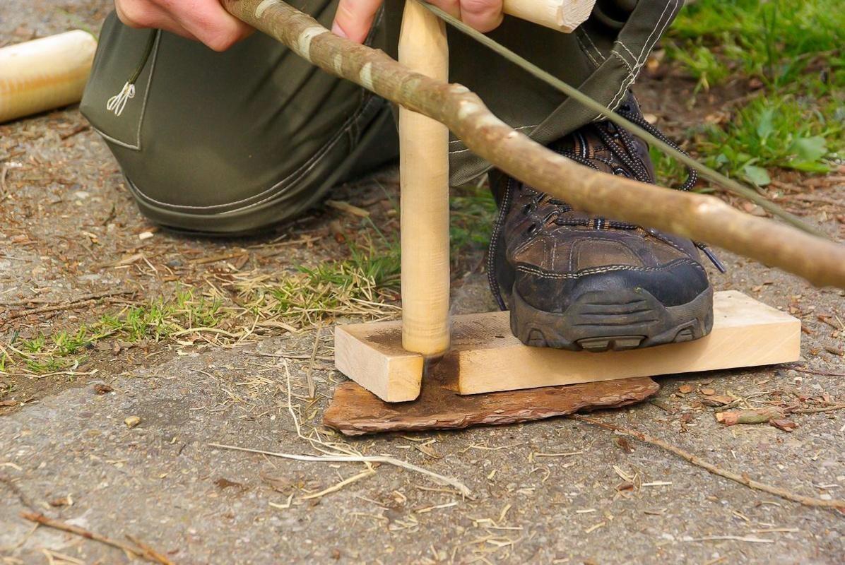 Holzstück wird mit einem Feuerbohrer bearbeitet