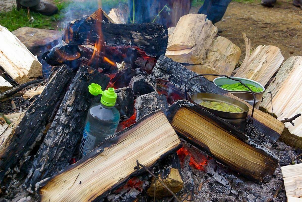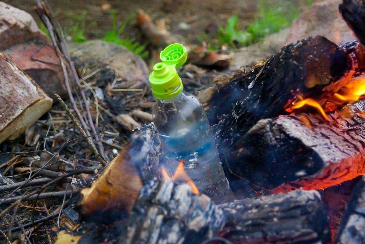 Wasserflasche steht zwischen brennenden Holzscheiten im Feuer
