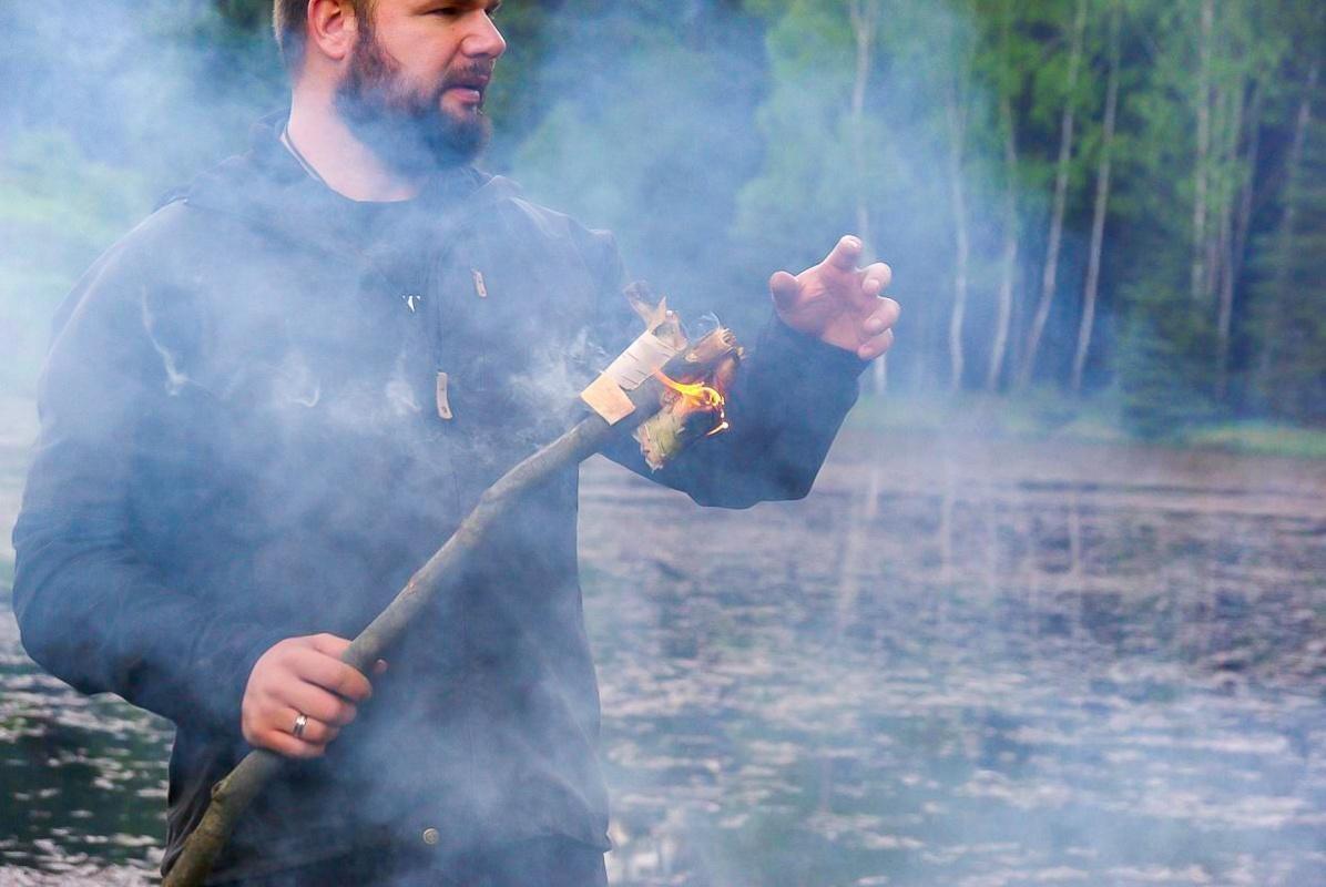 Mann hält Stock über kleines Bodenfeuer am Ufer eines Gewässers
