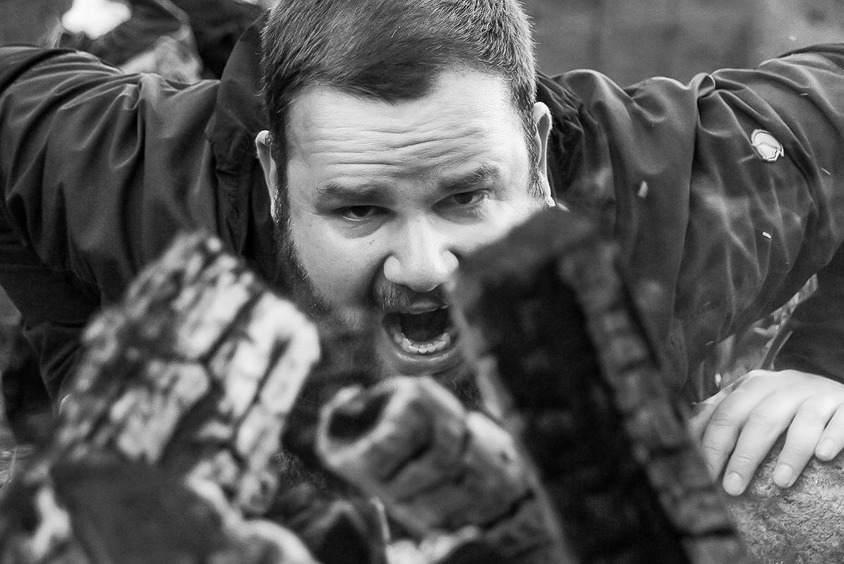 Mann beugt sich über glühende Holzscheite und ruft laut