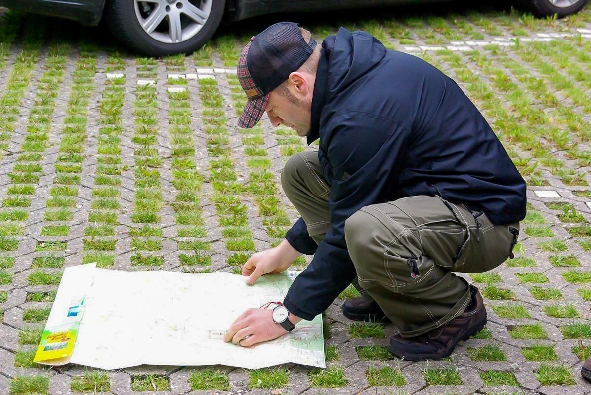 Mann kniet auf dem Boden und betrachtet Karten und Ausrüstung
