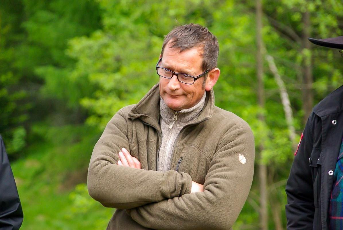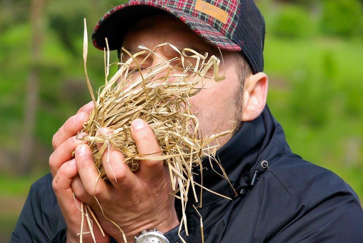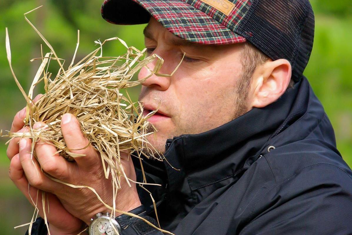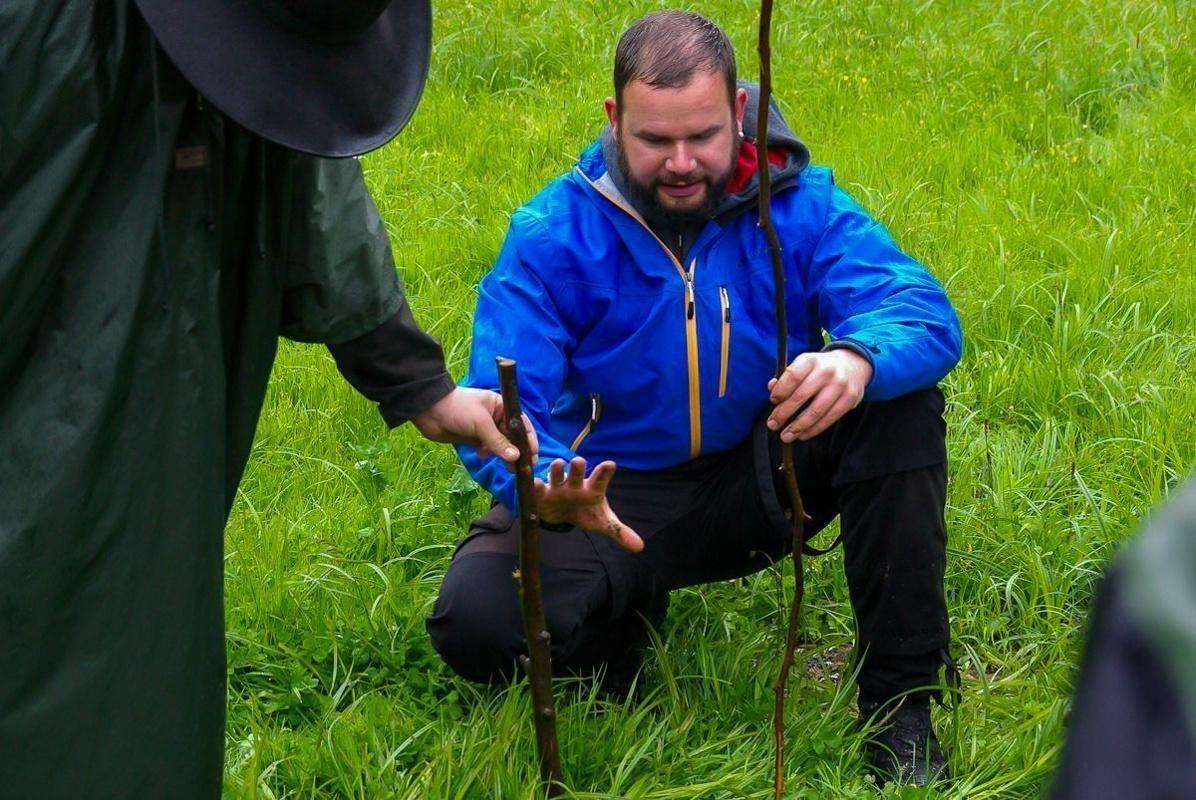 Mann erklärt eine Technik mit einem langen Stock in einer grünen Wiese