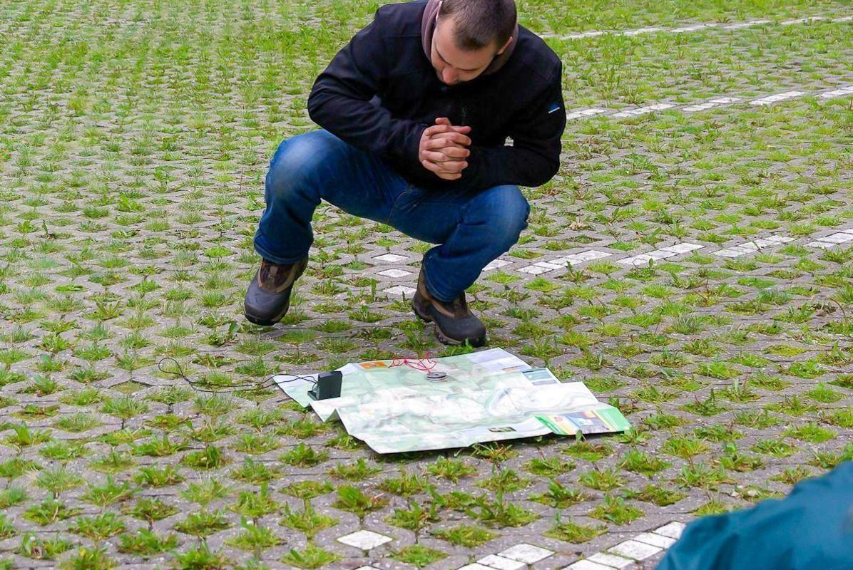 Mann kniet vor einer ausgebreiteten Karte auf dem Boden