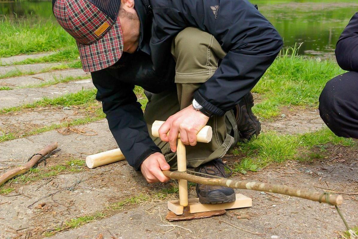 Feuerbohrer erzeugt durch Druck und Drehung Funken auf Zunder