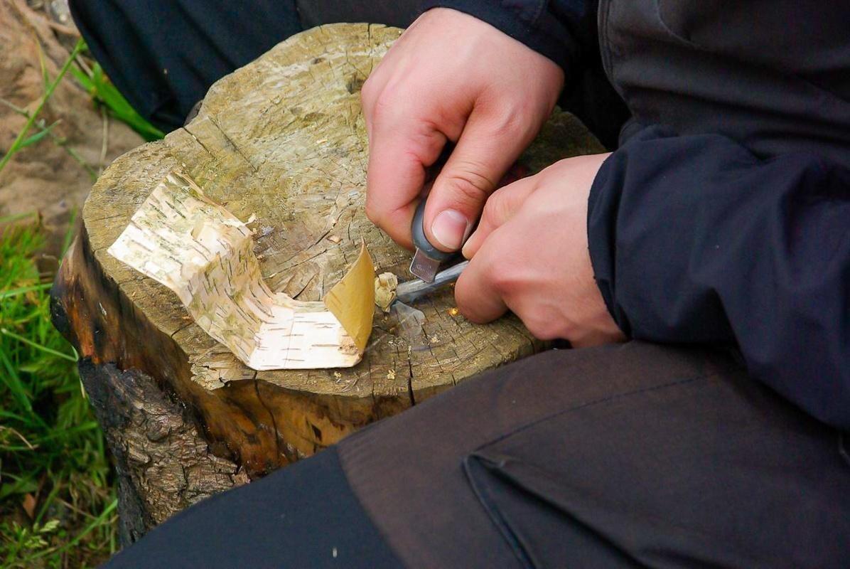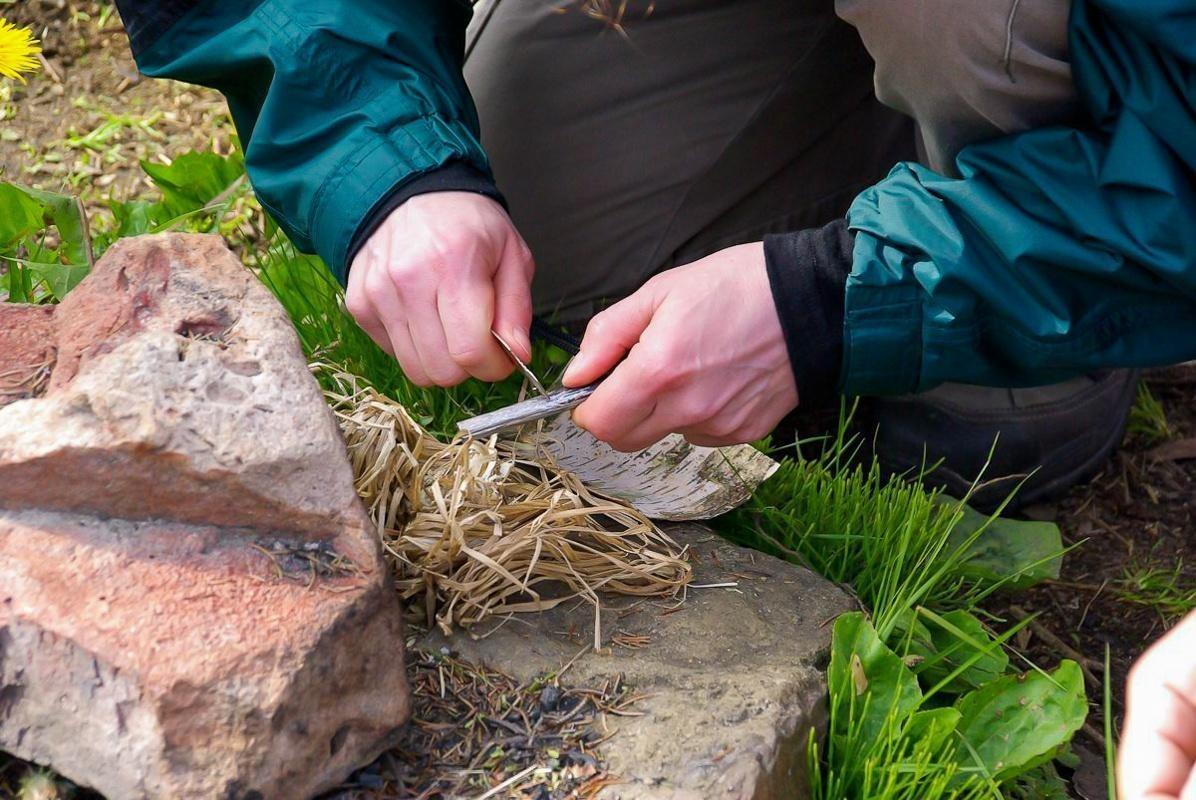 Messer drückt auf Holzstücke zur Zunderherstellung auf einer Steinplatte