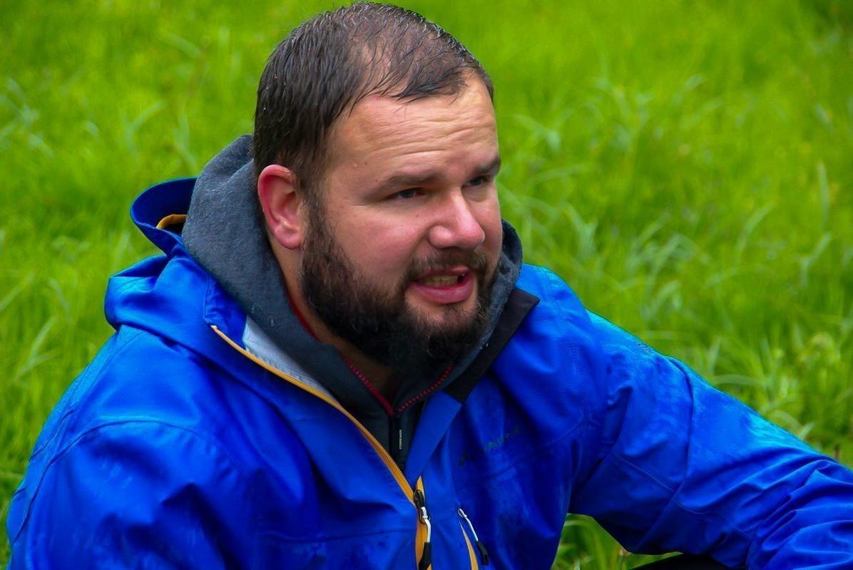 Mann kniet im Gras und hält einen Stock, während er auf einen anderen zeigt