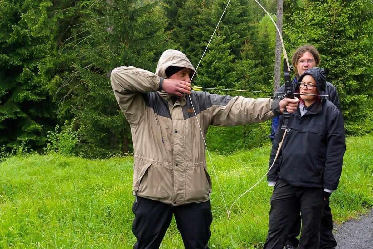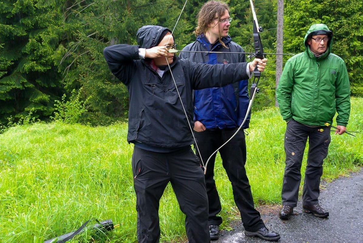 Person zielt mit einem Bogen auf ein Ziel, zwei weitere Personen beobachten