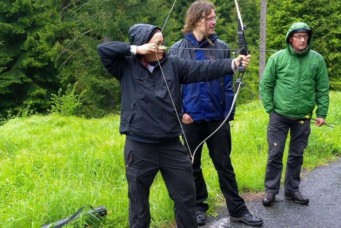 Person zielt mit einem Bogen auf ein Ziel, während andere zuschauen