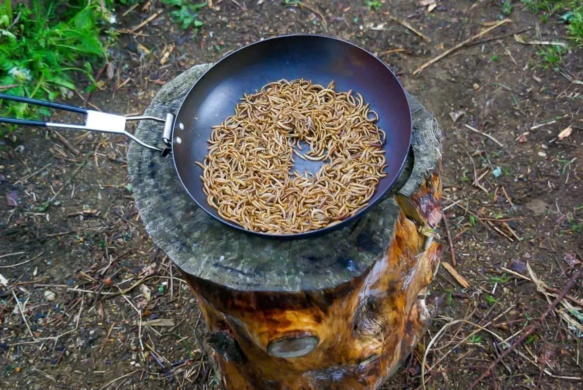 Pfanne mit gerösteten Insekten auf einem Baumstumpf platziert
