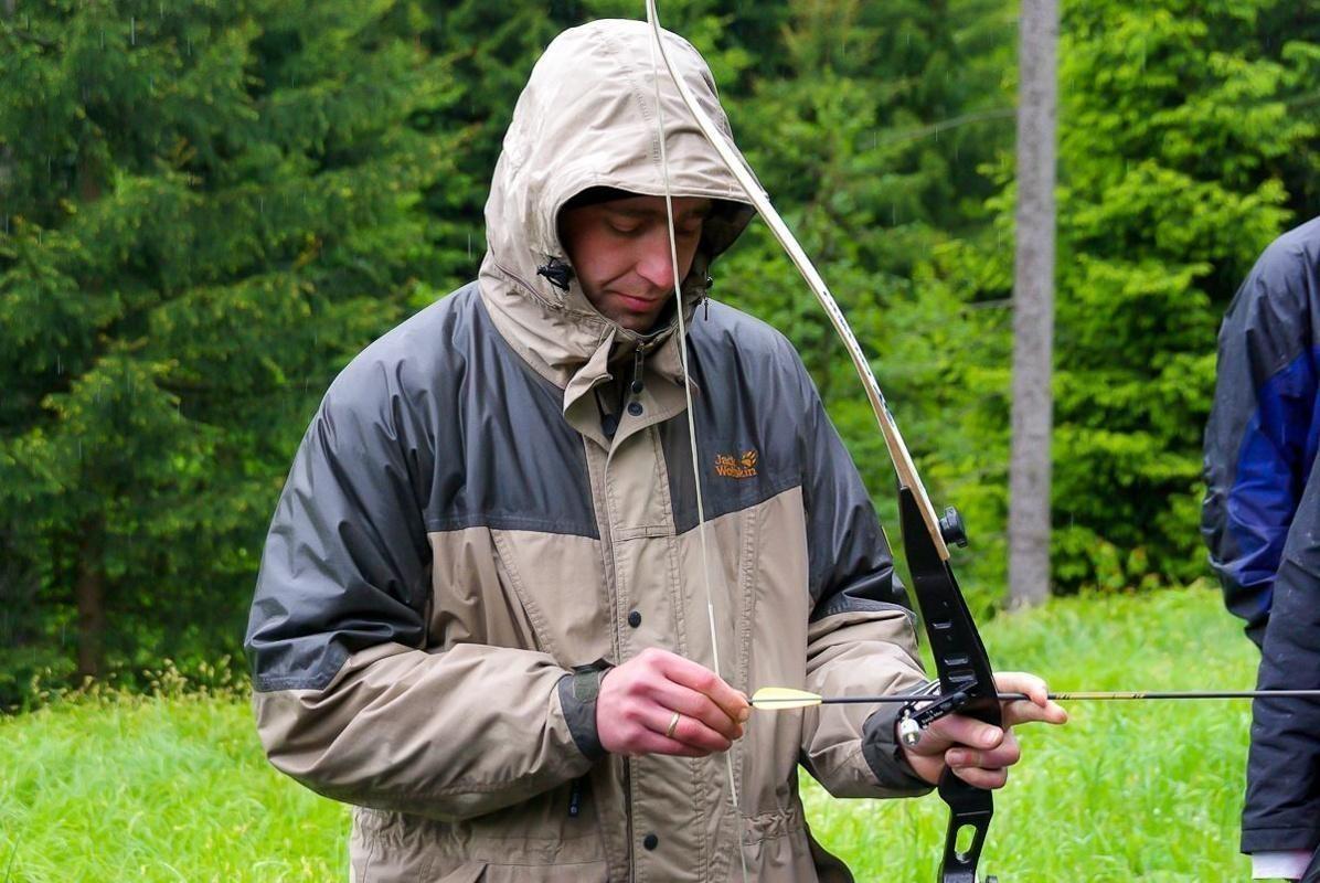 Pfeil wird an einem Bogen gespannt, während eine Person in wetterfester Kleidung steht