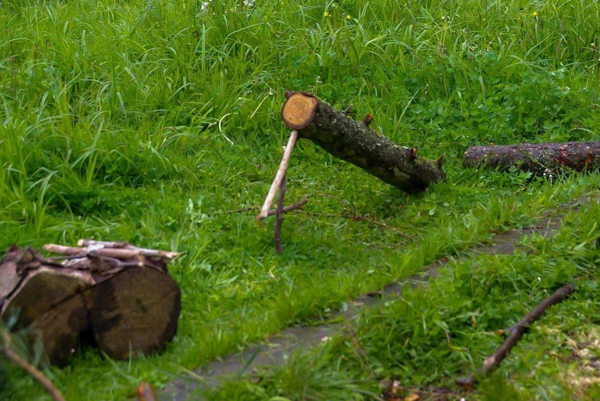Schlagfalle (Figure-Four/4er-Falle) aus Holzstücken im Gras