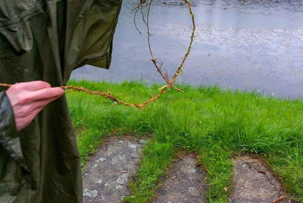 Hände halten eine Schnur, während im Hintergrund Bäume und Regen sichtbar sind