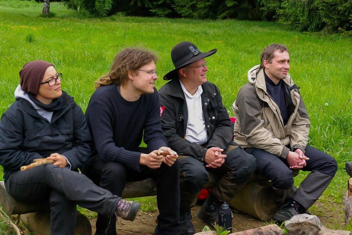 Vier Personen sitzen auf Baumstämmen und halten Holzstücke in der Hand