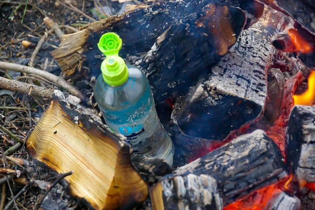 Wasserflasche steht zwischen brennenden Holzstücken im Feuer