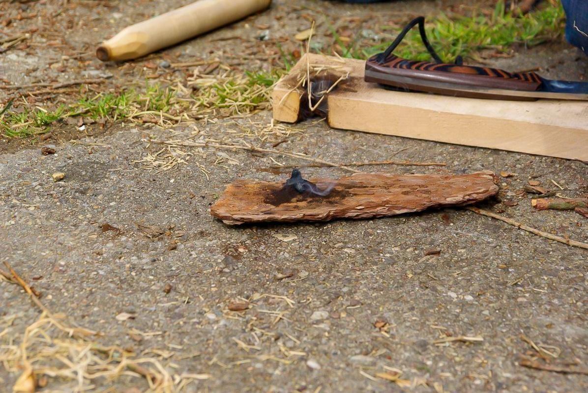 Holzstück wird mit einem Feuerbohrer bearbeitet, Zunder liegt bereit