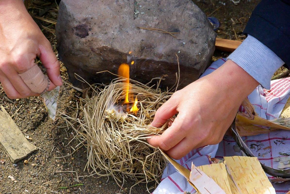 Zunder wird mit beiden Händen vorbereitet und auf einen Untergrund gelegt