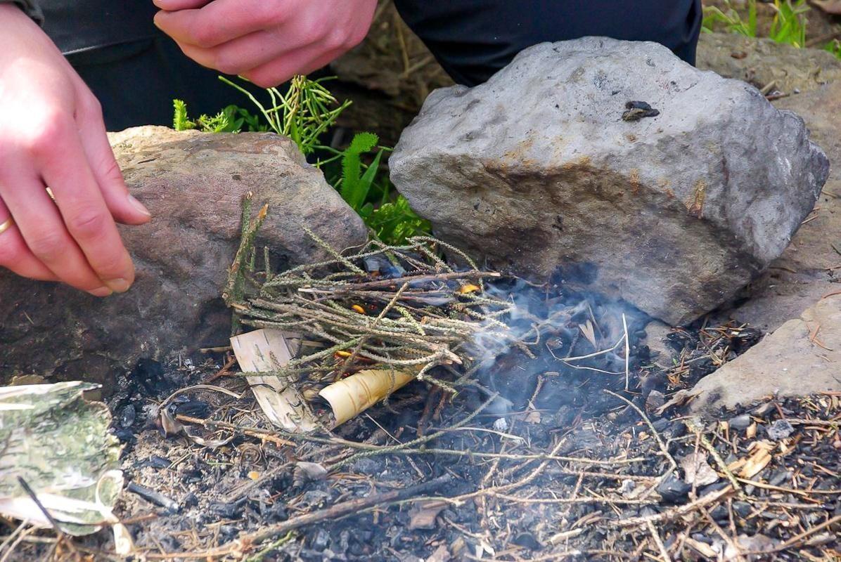 Zunder glimmt über einem kleinen Bodenfeuer, zwei Personen bereiten es vor