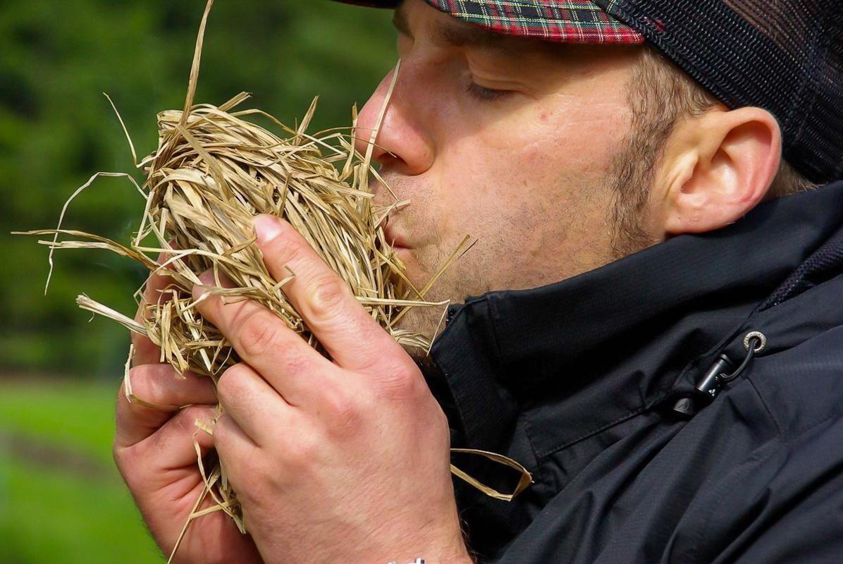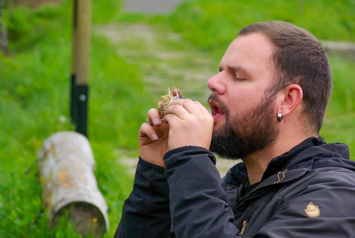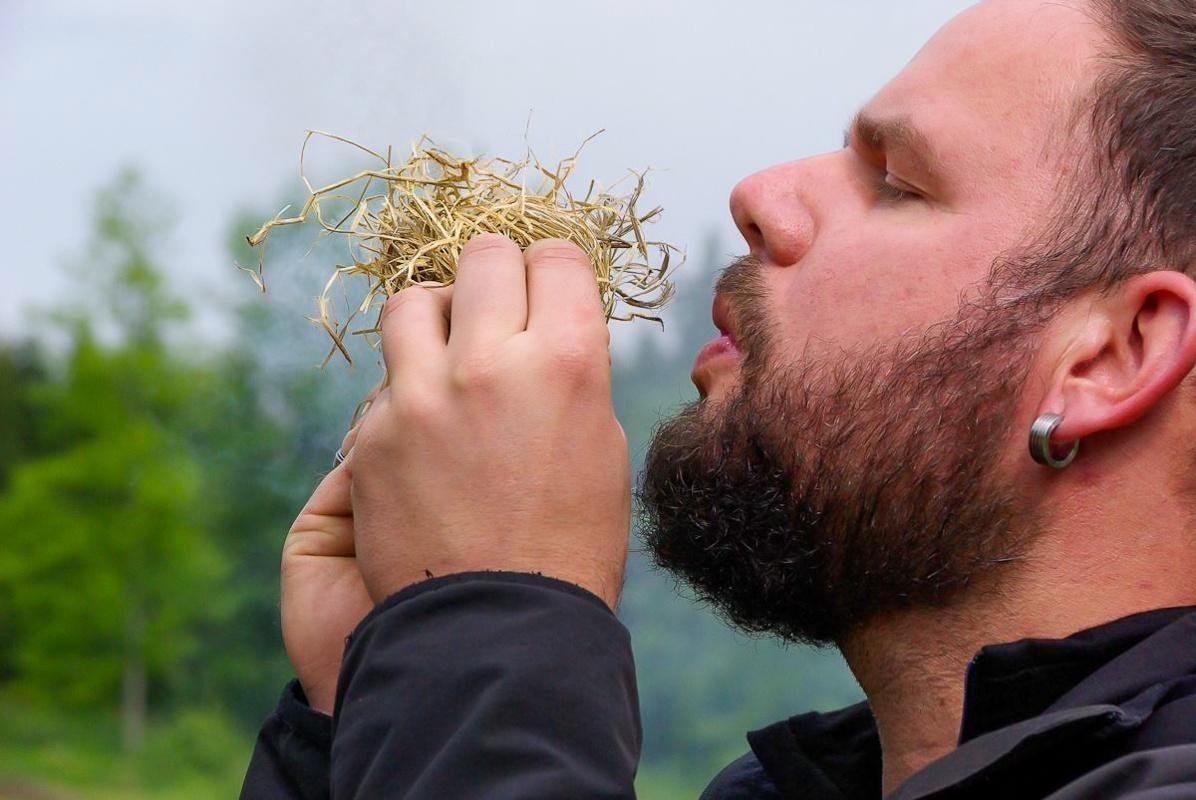 Zunder wird mit Lippen angeblasen, um Glut zu erzeugen