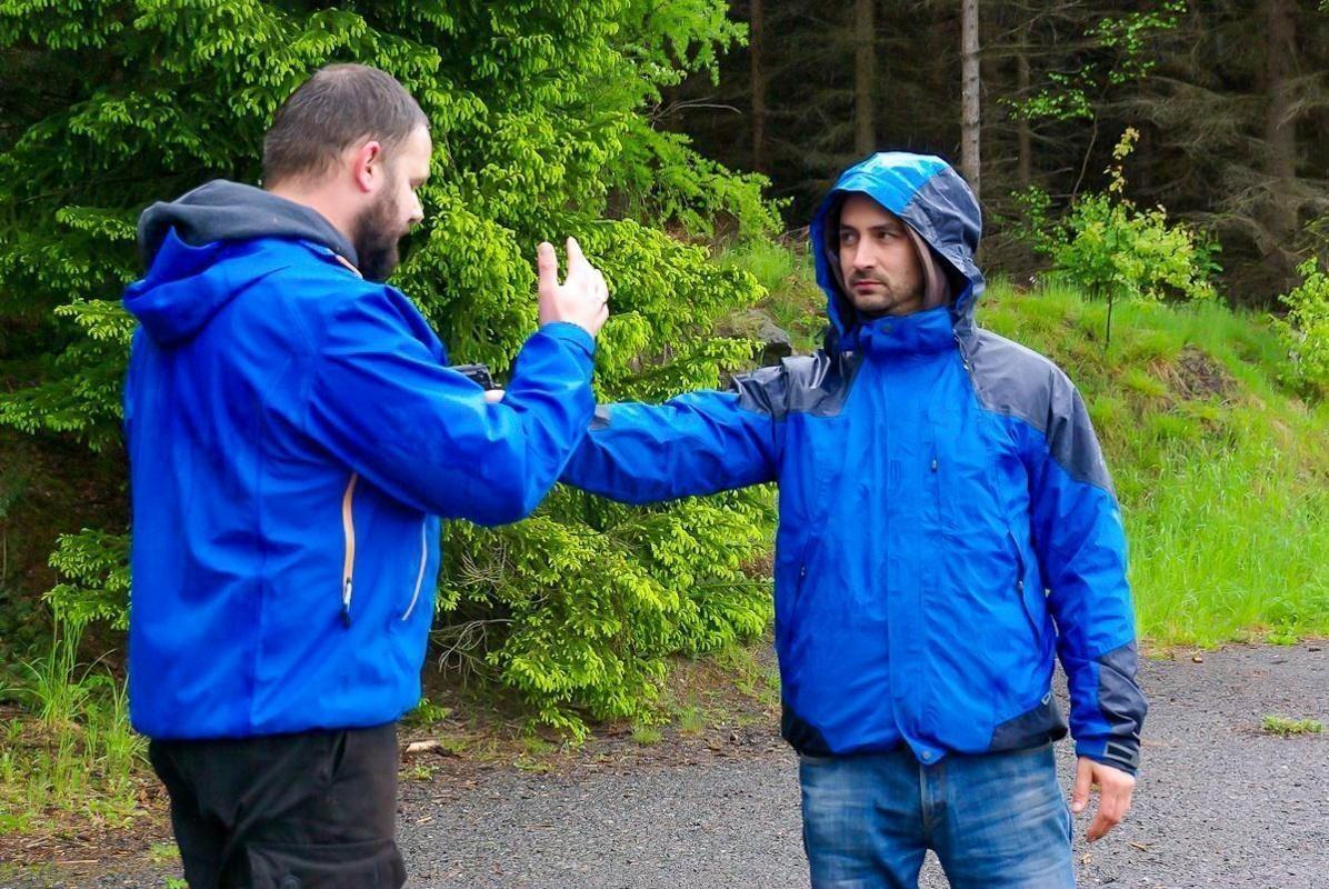 Zwei Personen in blauen Jacken demonstrieren eine Technik zur Kommunikation im Freien