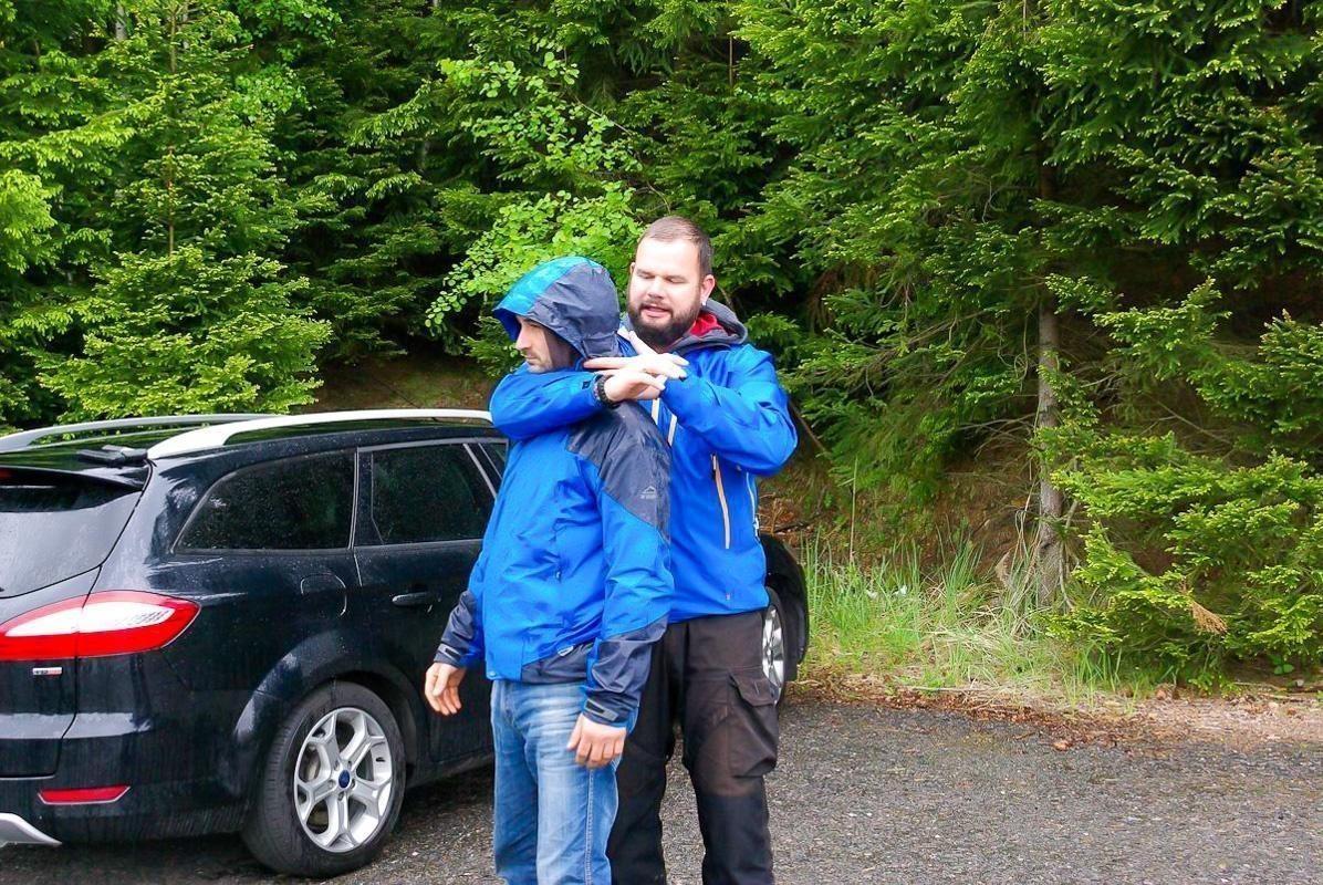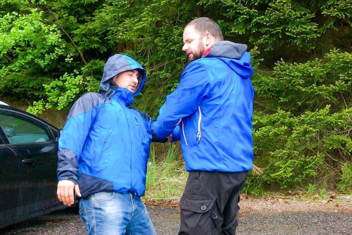 Zwei Personen in blauen Jacken stehen neben einem schwarzen Auto im Wald