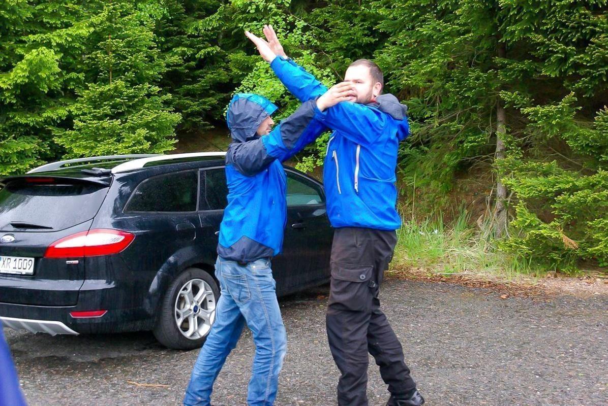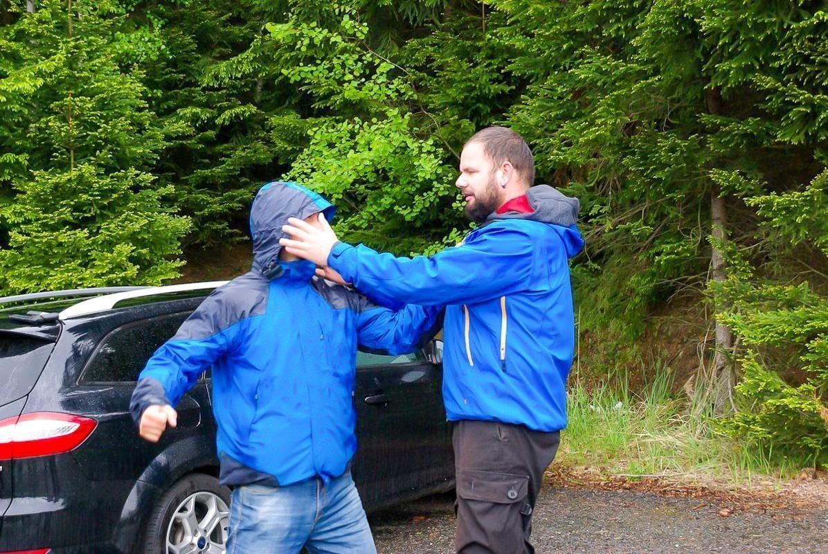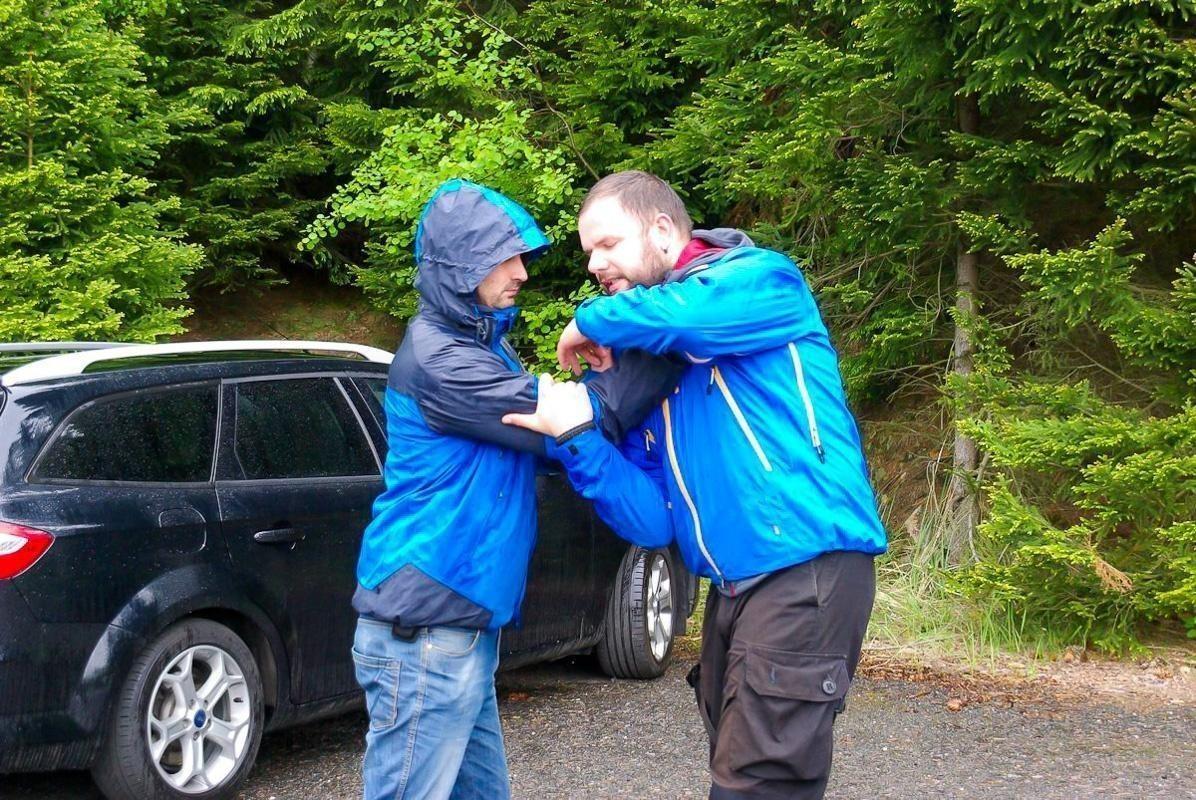 Zwei Personen üben eine Technik zur Selbstverteidigung neben einem Auto