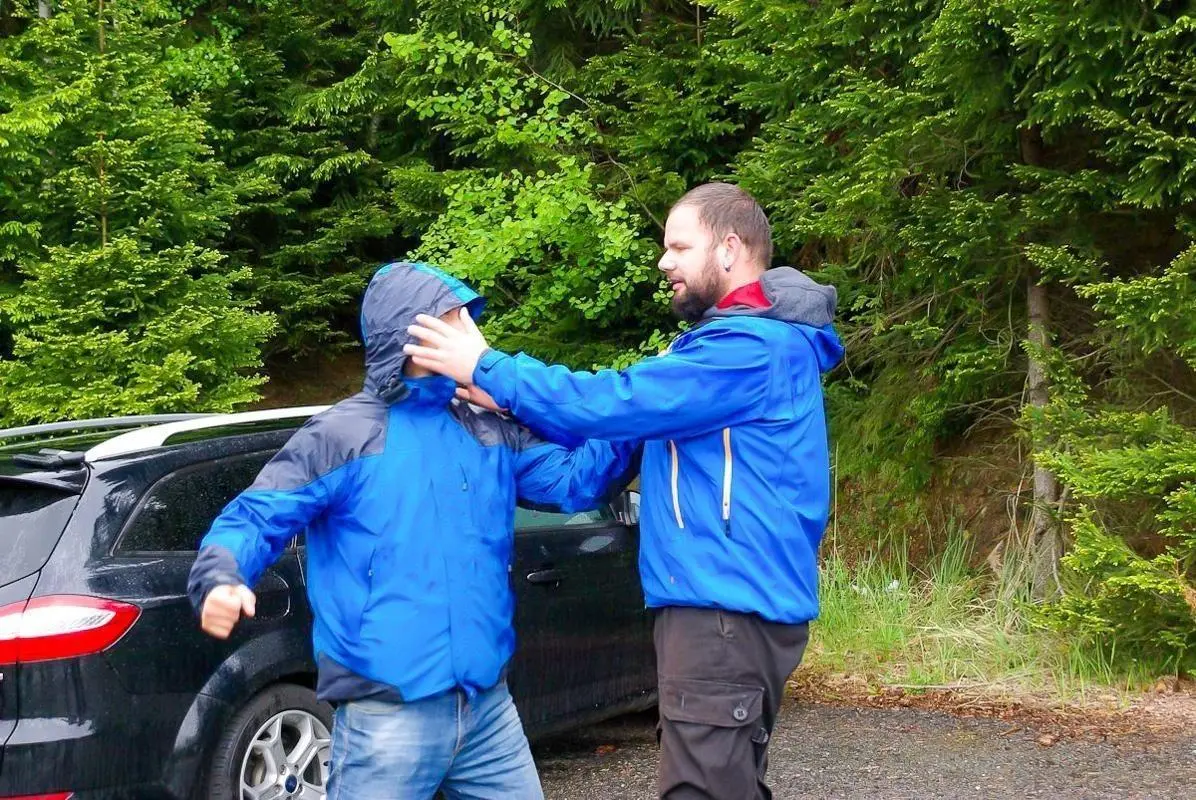 Zwei Personen in blauen Jacken üben eine Kontrolle aus, einer hält den anderen am Hals