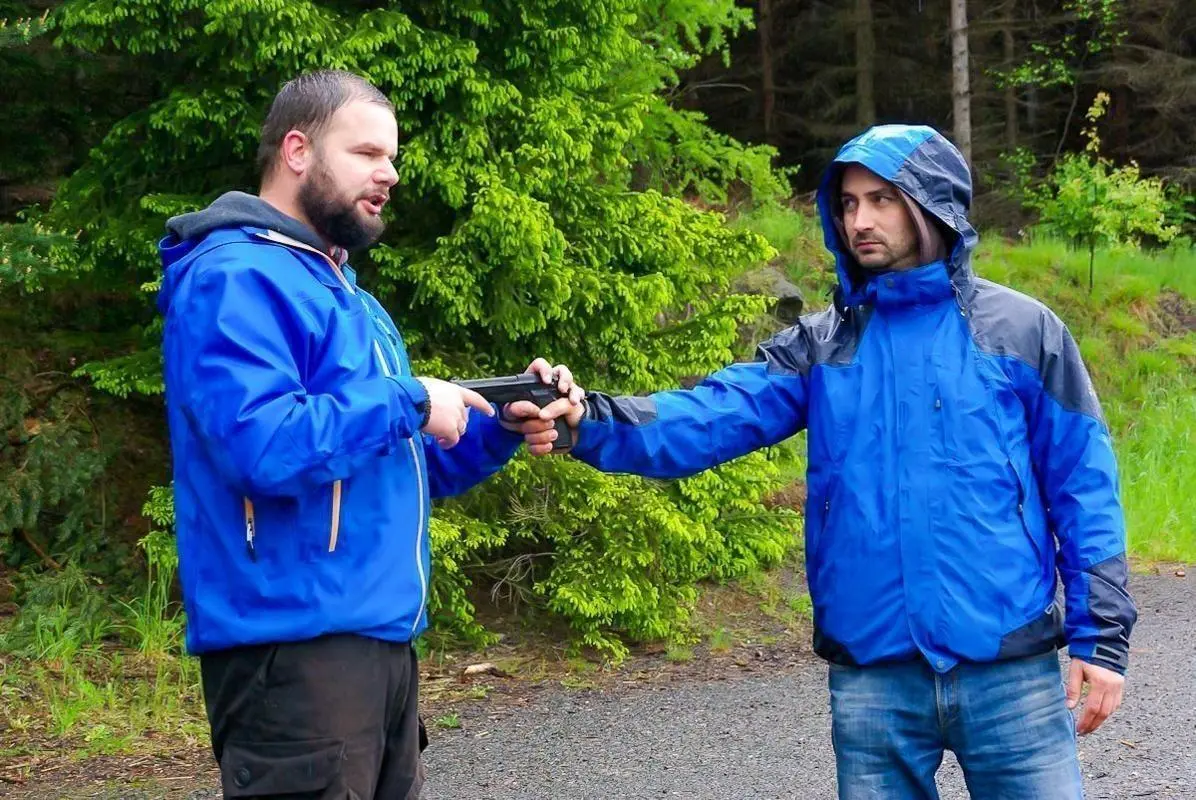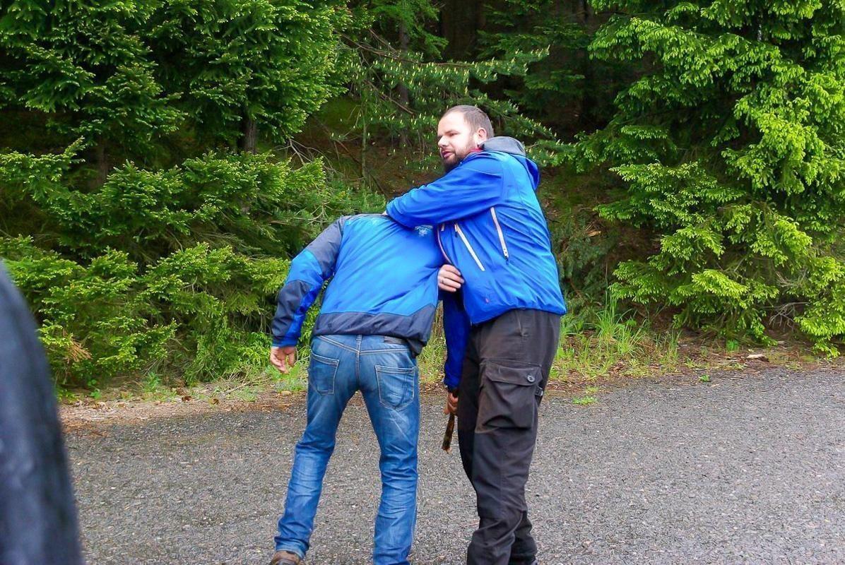 Zwei Personen in blauen Jacken übergeben sich einen Gegenstand im Wald