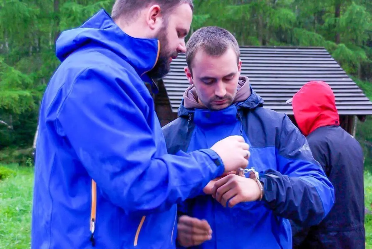 Zwei Personen in blauen Jacken überprüfen eine Uhr im Freien