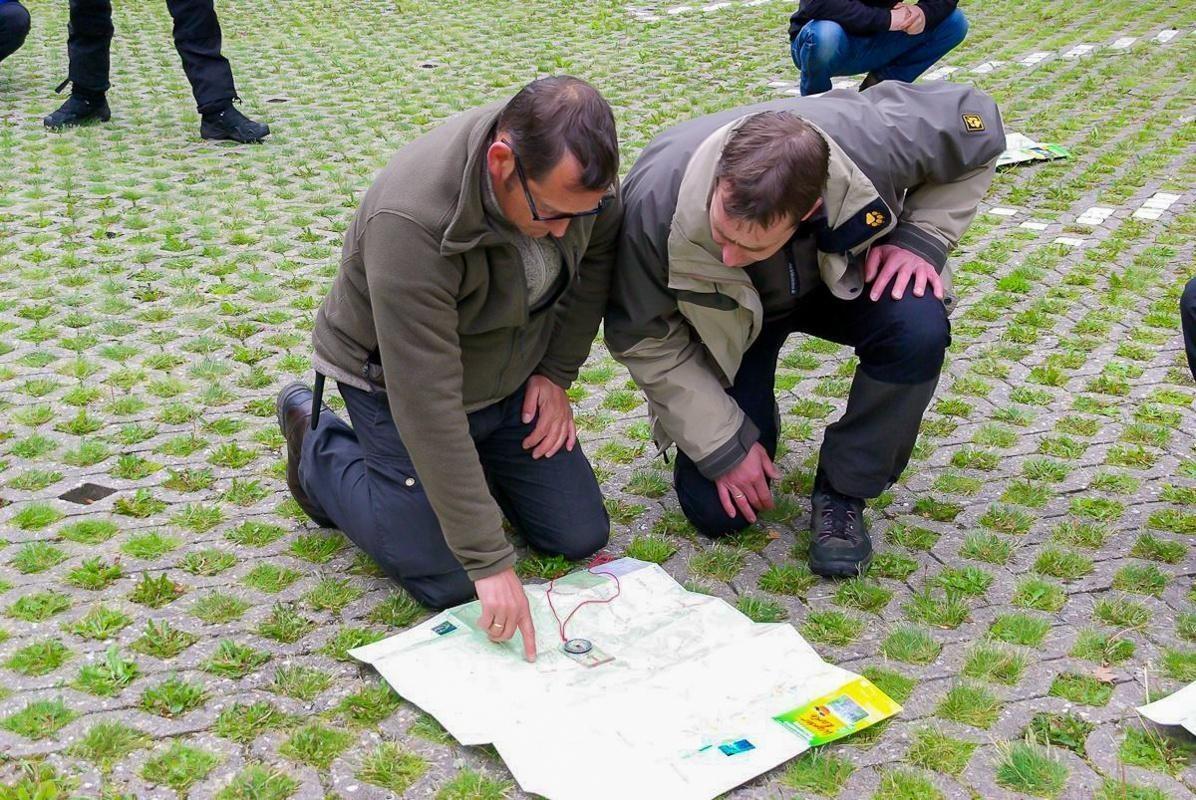 Zwei Personen knien auf dem Boden und studieren eine Karte