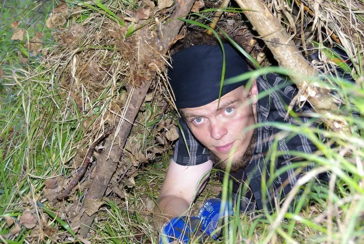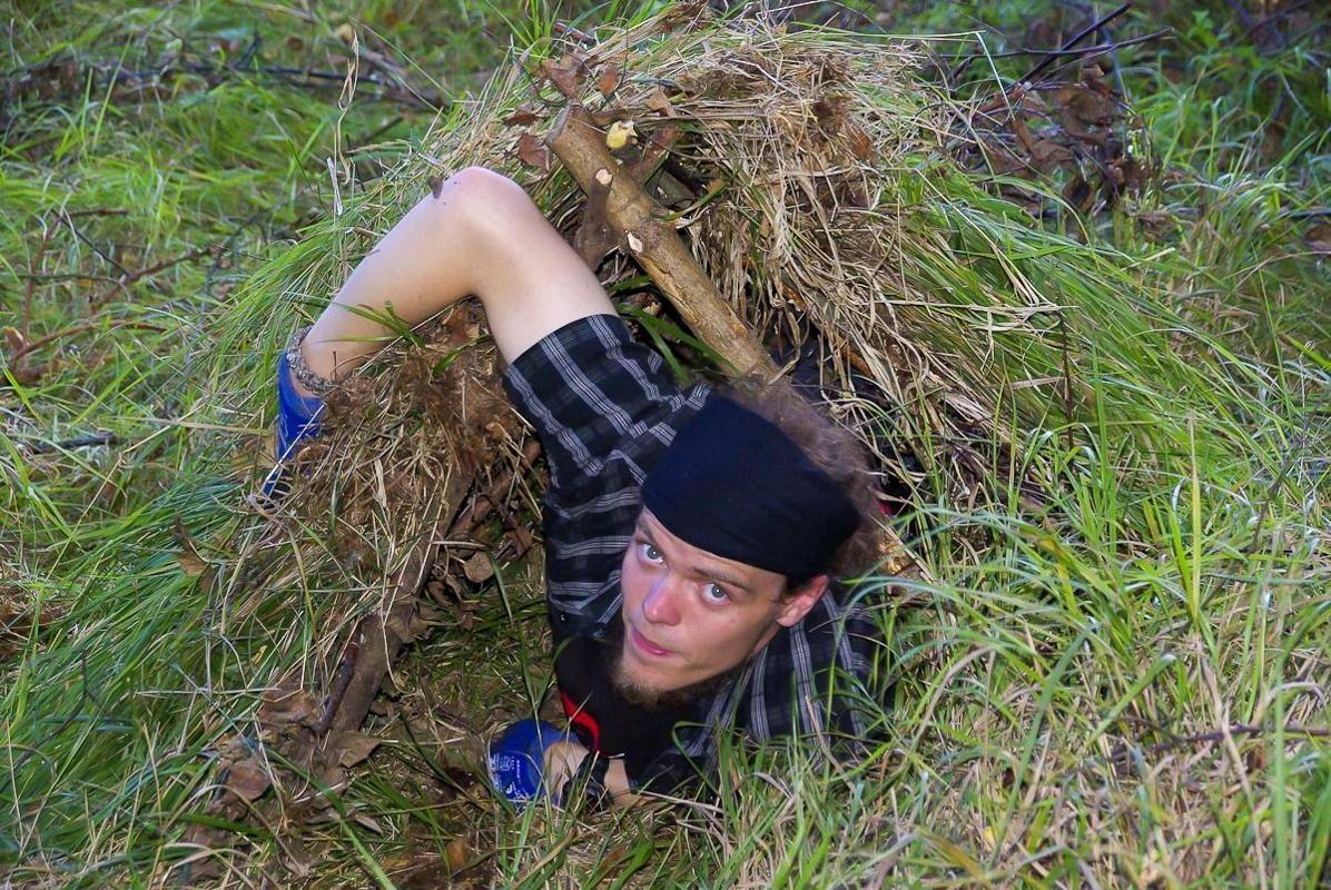 Mann kriecht in eine selbstgebaute Laubhütte aus Ästen und Gras