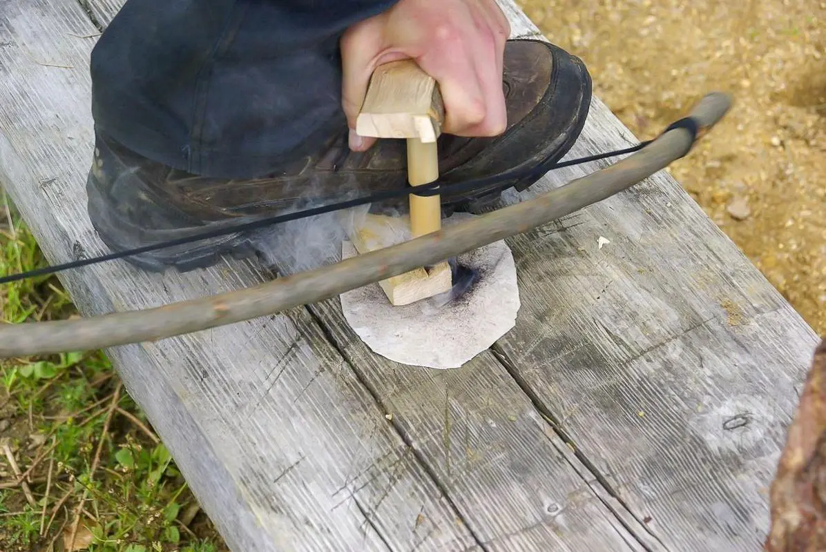 Feuerbohrer erzeugt Glutnest aus Zunder durch Reibung
