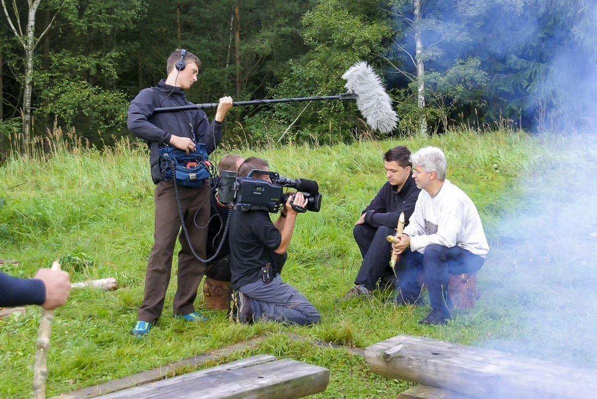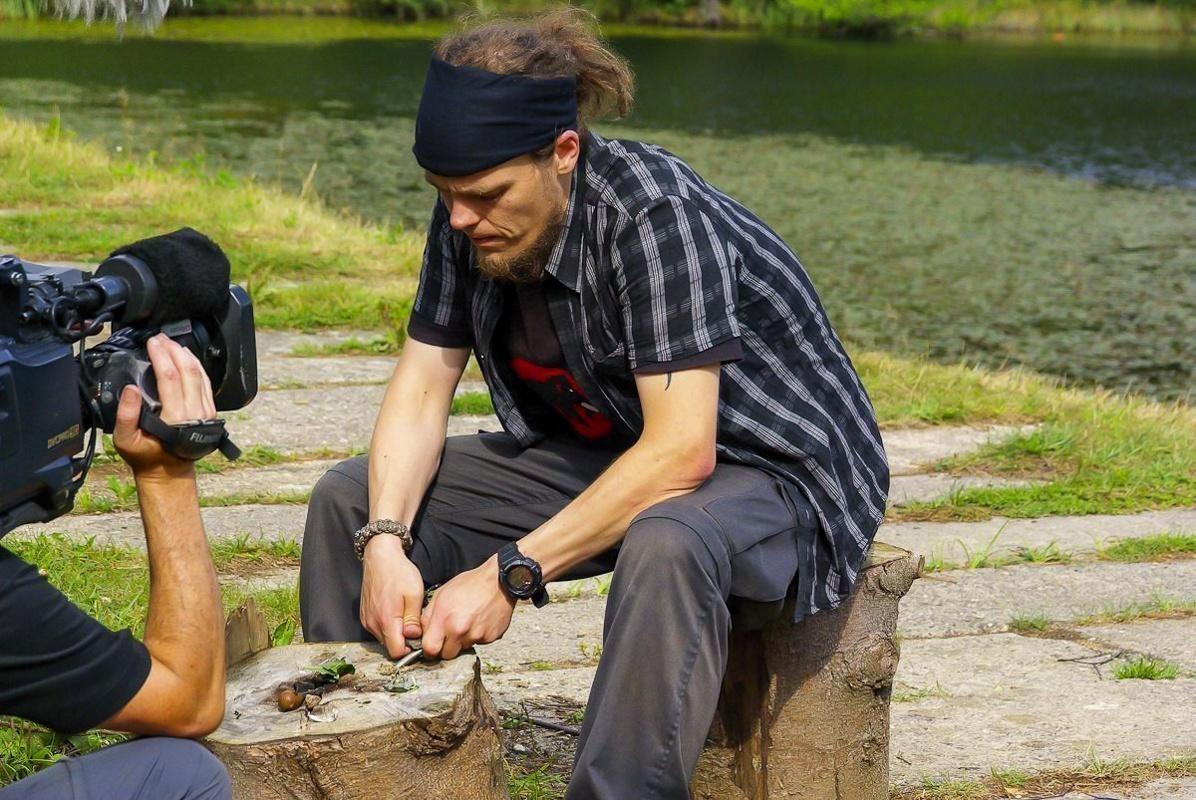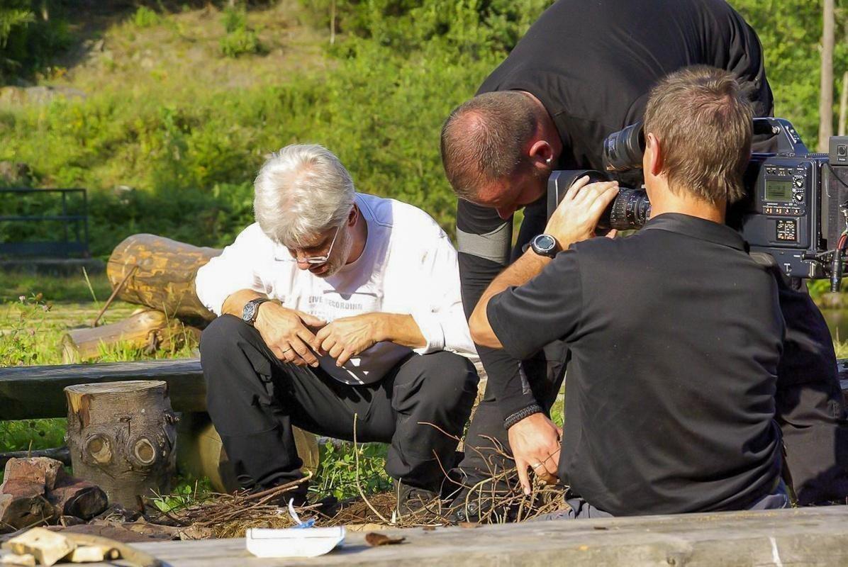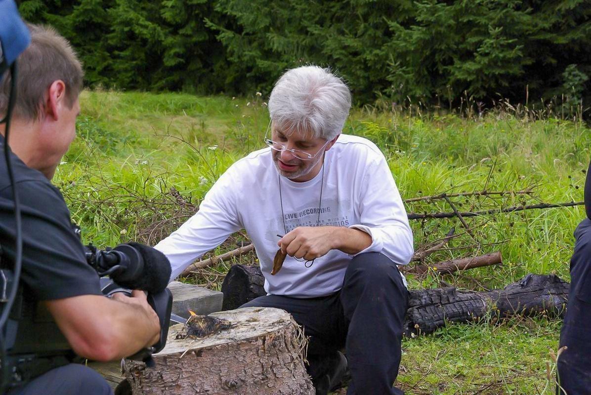 Mehrere Personen arbeiten an einem Holzstück auf Baumstümpfen, Kamera und Mikrofon sind sichtbar