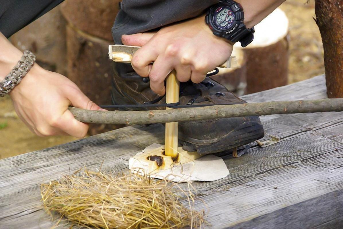 Bogenfeuerbohrer erzeugt durch Druck und Drehung Funken auf Zunder