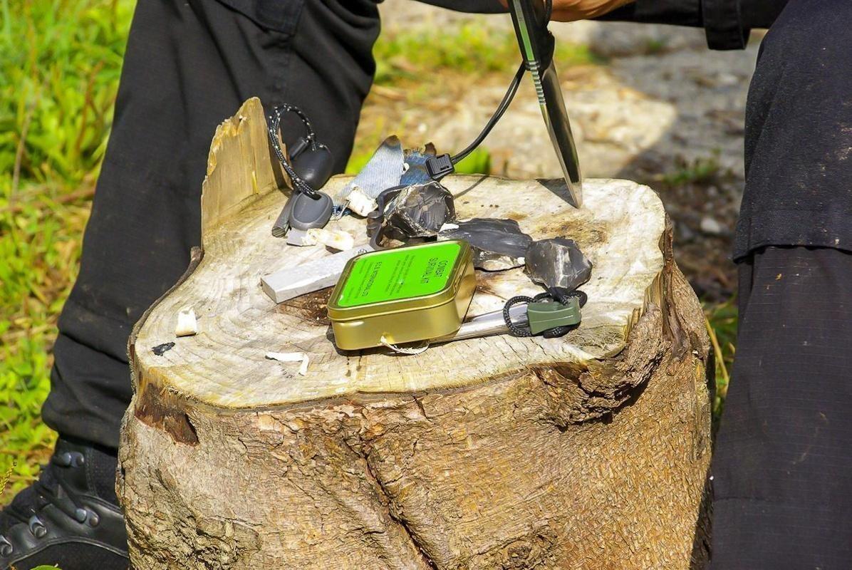Feuerstahl und Zunder liegen auf einem Baumstumpf, Hände bereiten sich vor