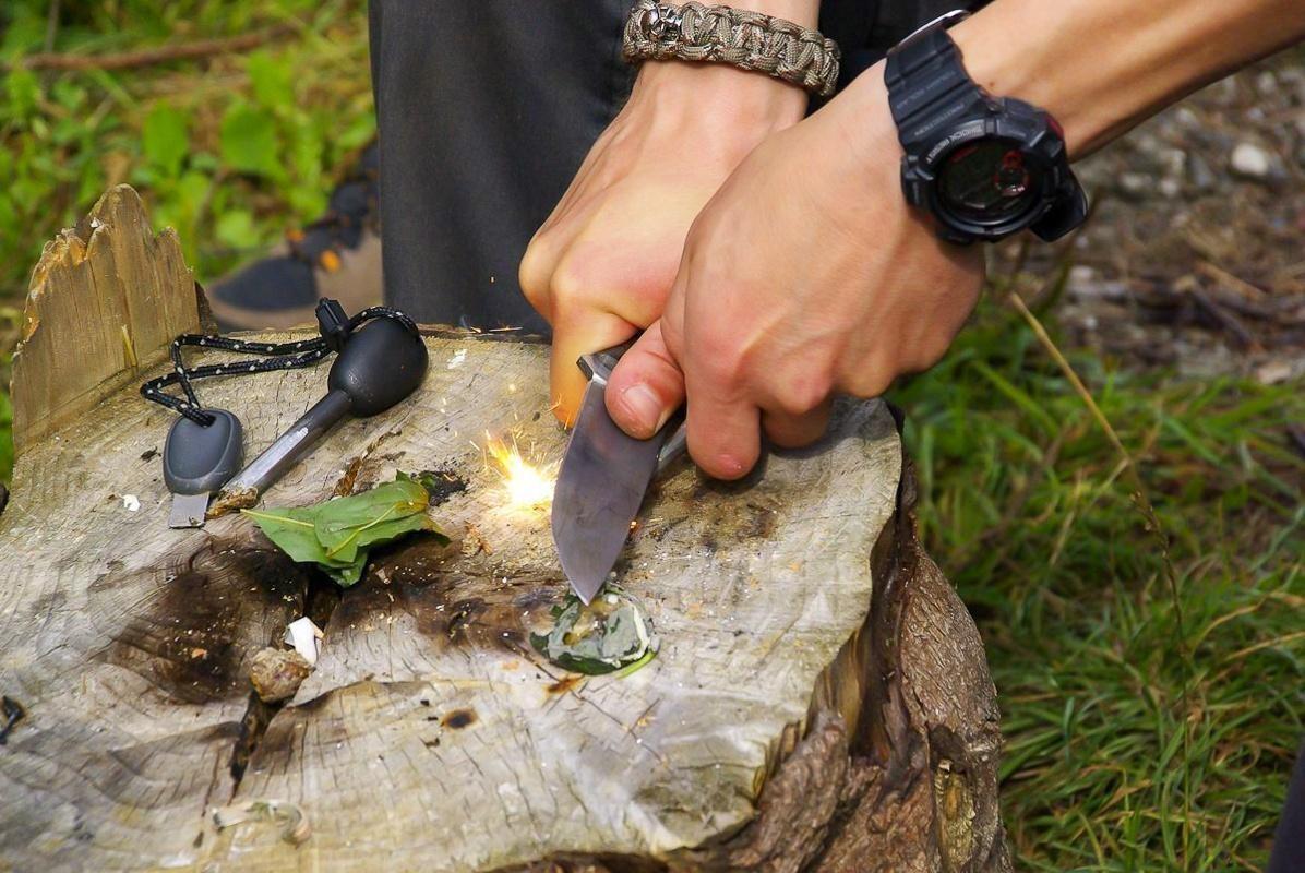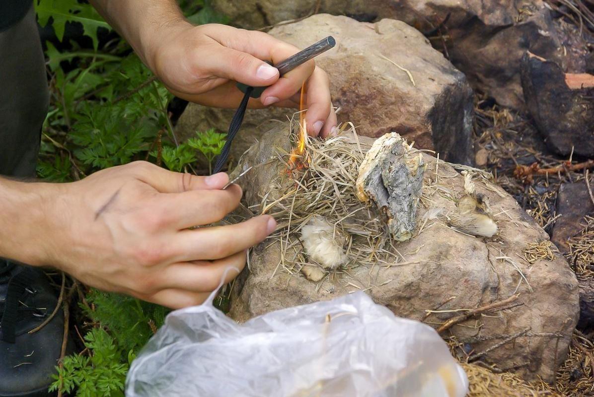 Feuerstahl erzeugt Funken auf Zunder während ein Messer verwendet wird
