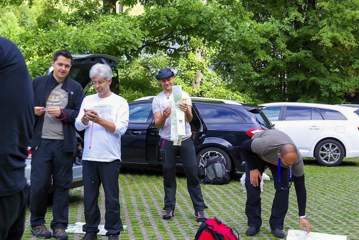 Gruppe diskutiert im Freien, Rucksäcke und Autos im Hintergrund sichtbar