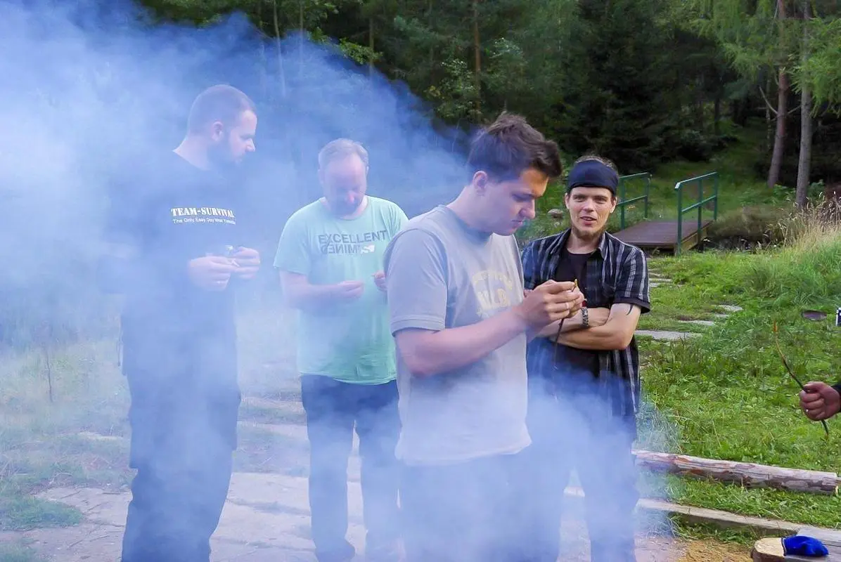 Gruppierung von vier Personen in Rauch, eine Person hält Zunder in der Hand