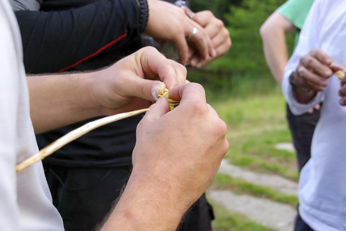 Hände halten einen kleinen Stock, während eine Technik demonstriert wird