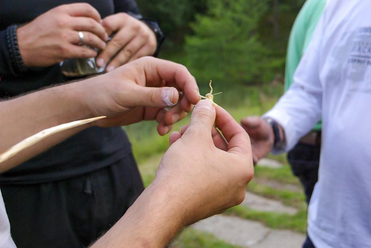 Hände formen eine Schnur aus Pflanzenmaterial für eine Technik