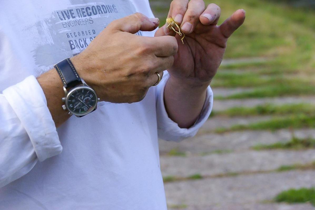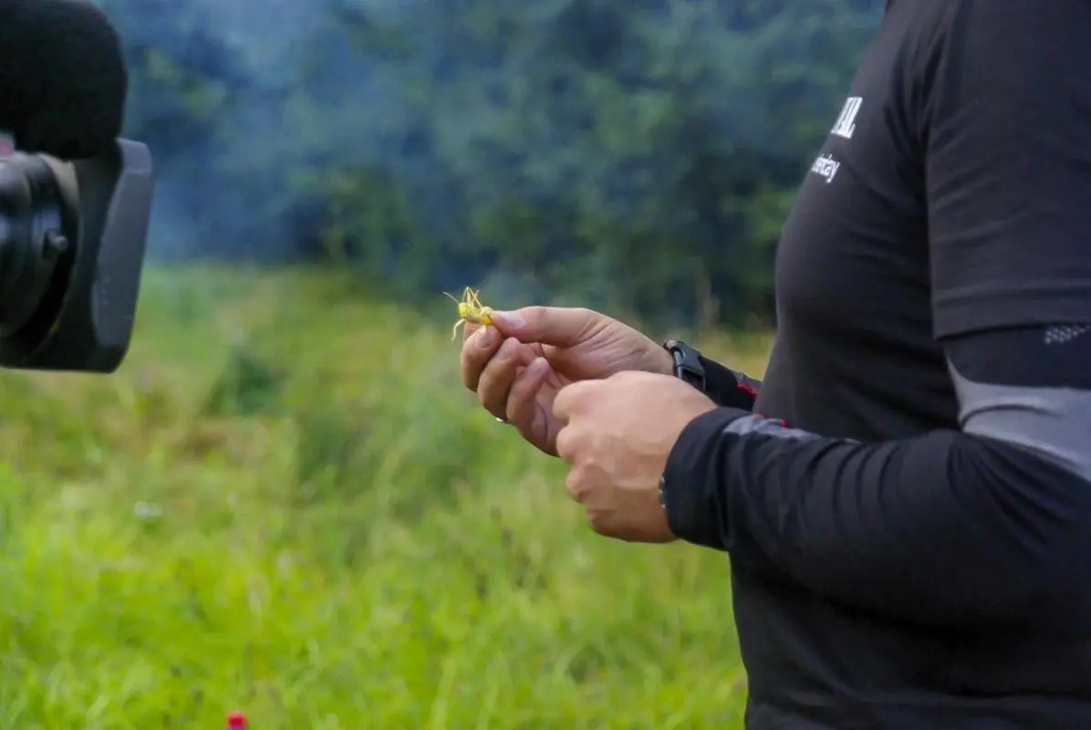 Hände halten eine kleine, lebende Kreatur in einem grünen Umfeld