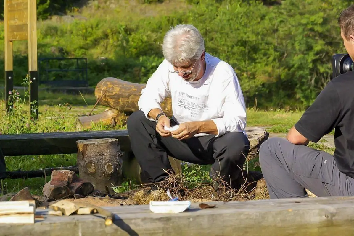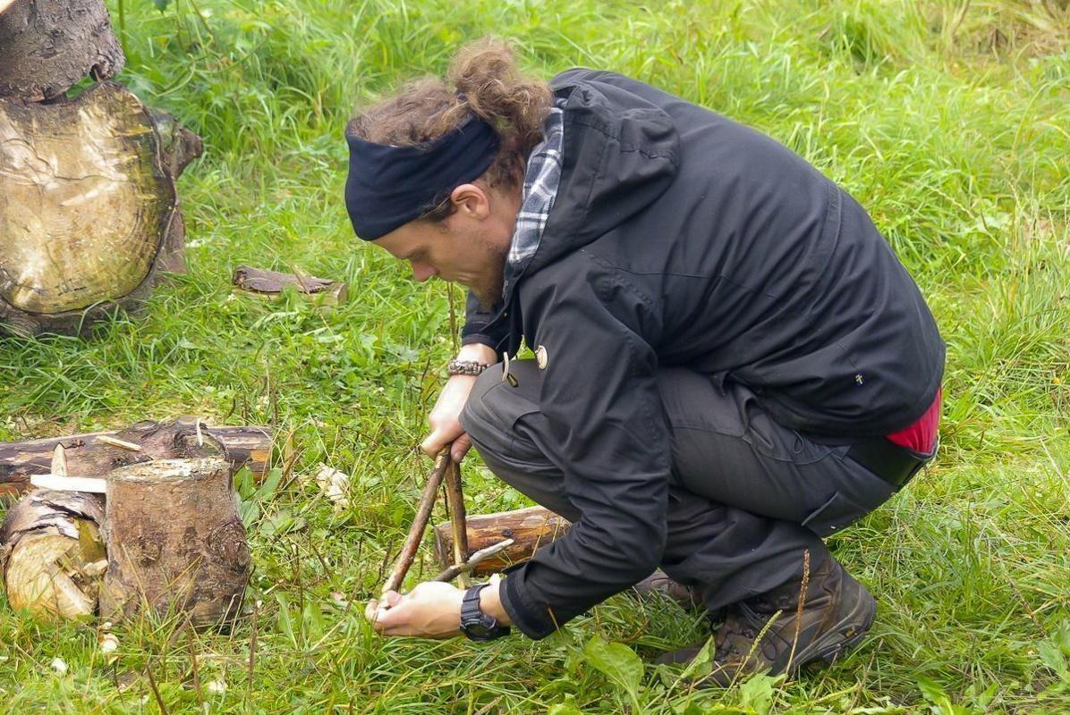 Mann bereitet Zunder für ein Feuer vor, umgeben von Zuschauern